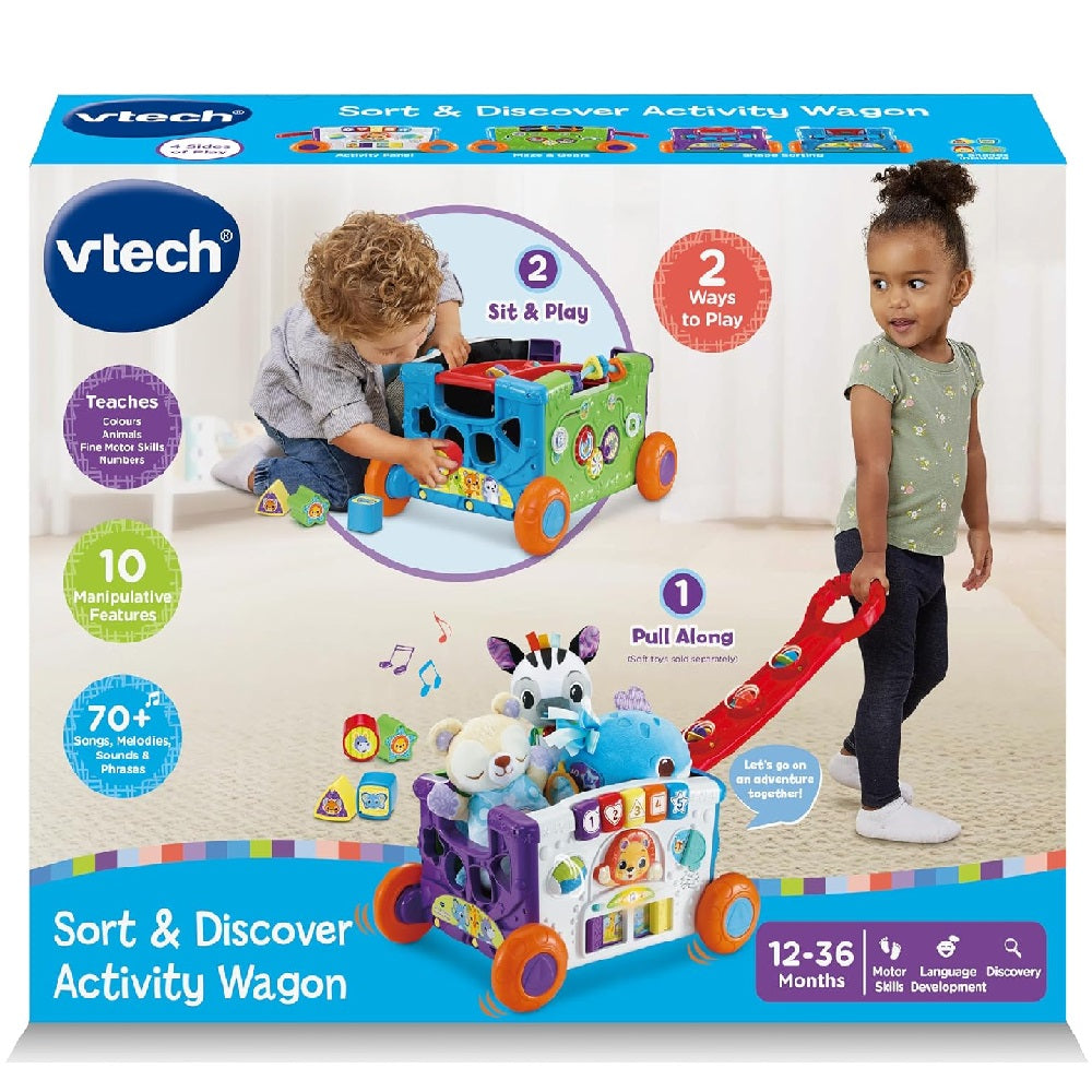Make learning and playtime fun with the VTech Sort & Discover Activity Wagon™, an interactive toy designed to teach shapes, colors, numbers, and animals while encouraging toddlers to move and explore. This engaging activity wagon combines early learning, hands-on play, and active exploration in one durable toy.