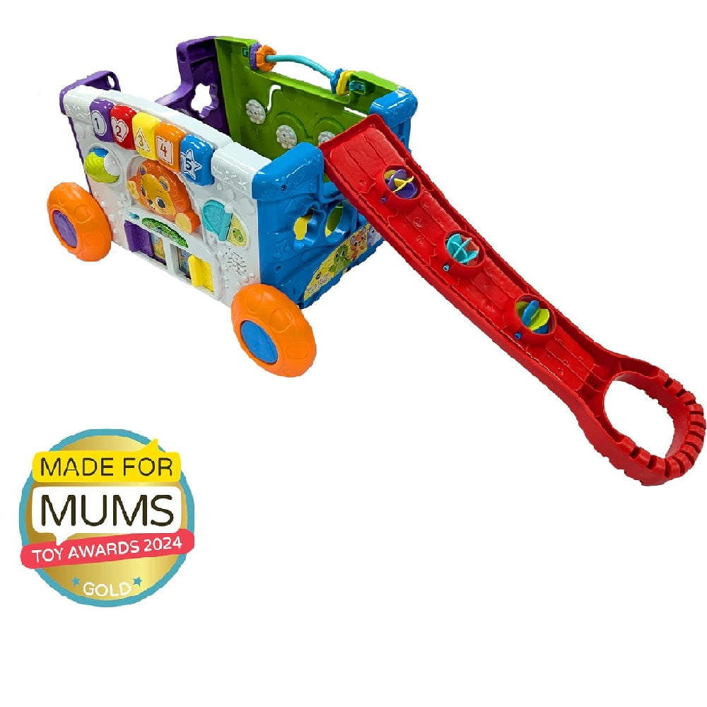 The wagon features colorful buttons, shape sorters, and animal figures that play cheerful phrases, sounds, and music. As children push the wagon around, they are motivated to walk, crawl, and develop gross motor skills, while learning essential early concepts.