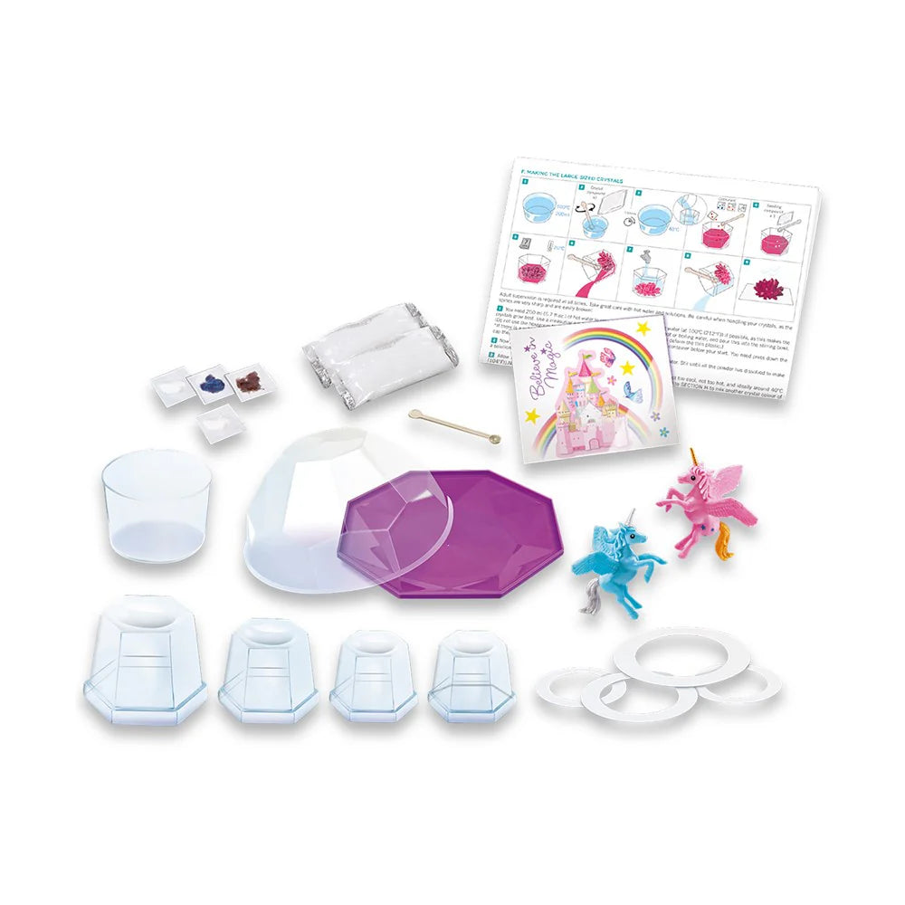Contents: 2 Unicorns figurines, 1 coloured sticker, 2 white crystal compounds, 3 colourants, 1 white seeding compound, 1 stirring bowl & spoon, transparent growing cups (1 large, 1 medium & 2 small), 1 terrarium tray with cover, ring-shape templates and detailed instructions.
