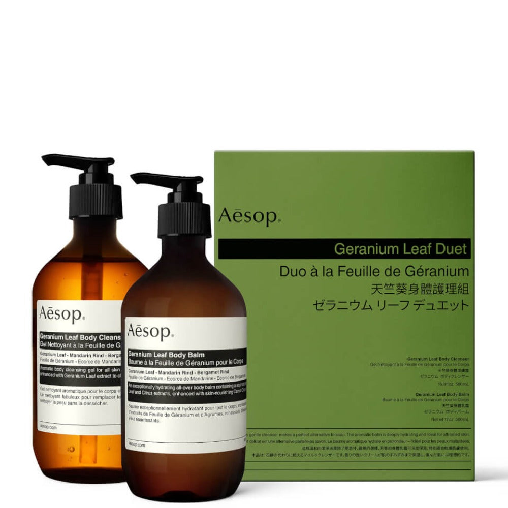 Uniting two of Aesop's favourites, the Geranium Leaf Body Cleanser and Balm Duet is your haul-in-one to cleansed and nourished limbs.