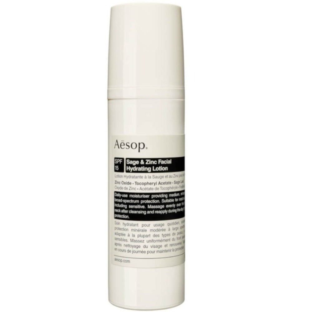 The Sage and Zinc Facial Hydrating Lotion SPF15 (50ml) from Aesop is ready and waiting to care for your complexion in all its aesthetic glory.
