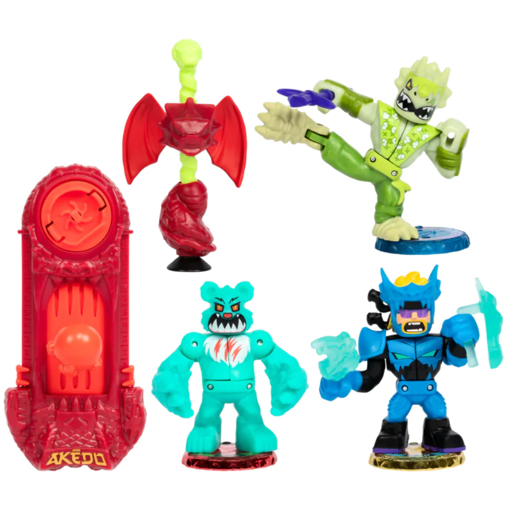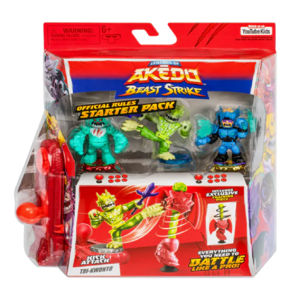 Kids can now prepare for battle with the Legends of Akedo Official Rules Beast Strike Starter Pack. Players can train to become a legend of Akedo and develop their skills with the bonus training piece that spins down when struck! This Starter Pack includes 3 Akedo Warriors. 1 Legendary Warrior - Tri-Kwonto, 1 Beast Striker - Super Shreddy Bear and 1 Ultra Rare Warrior - Dragonblade Shades. Boys and girls can place their warriors on the pack's exclusive Joystick Controller and train their team to become Legends of Akedo Prepare For Battle The Legends of Akedo Beast Strike Starter Pack is the perfect for kids to prepare and get ready for an Akedo Tournament. It comes with everything they need to practice and develop their skills. Train Your Warriors With the Legends of Akedo Beast Strike Starter Pack, players can perfect their warriors SPLIT STRIKE with the bonus training piece. Real Kicking Action This Starter Pack includes 3 Arcade Warriors: One of which is the Legendary Warrior - Tri-Kwonto with a realistic kicking action who can deliver a Split Strike with their powerful blow. Kids can use their Joystick Controller to perfect his kicking action! Exclusive Controller The Legends of Akedo Beast Strike Starter Pack comes with an EXCLUSIVE Joystick Controller! Players can place their warriors on the Controller and train their team for next level battling action!