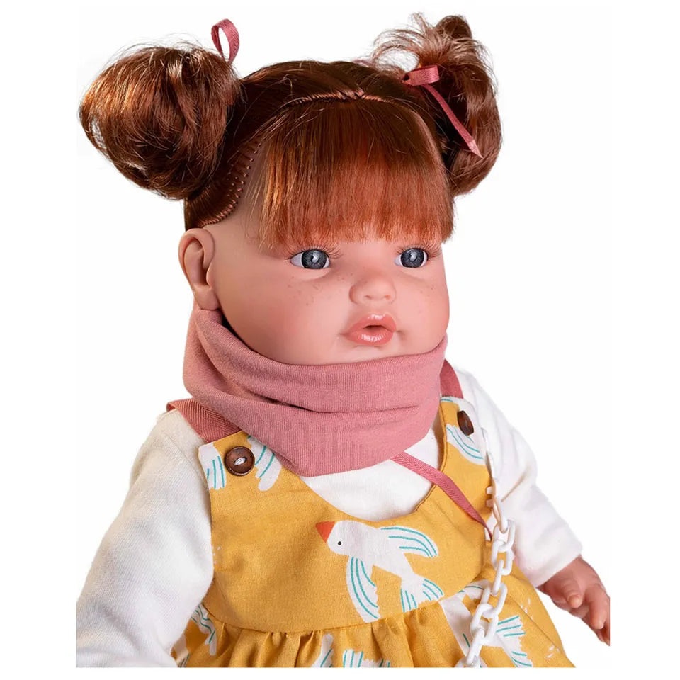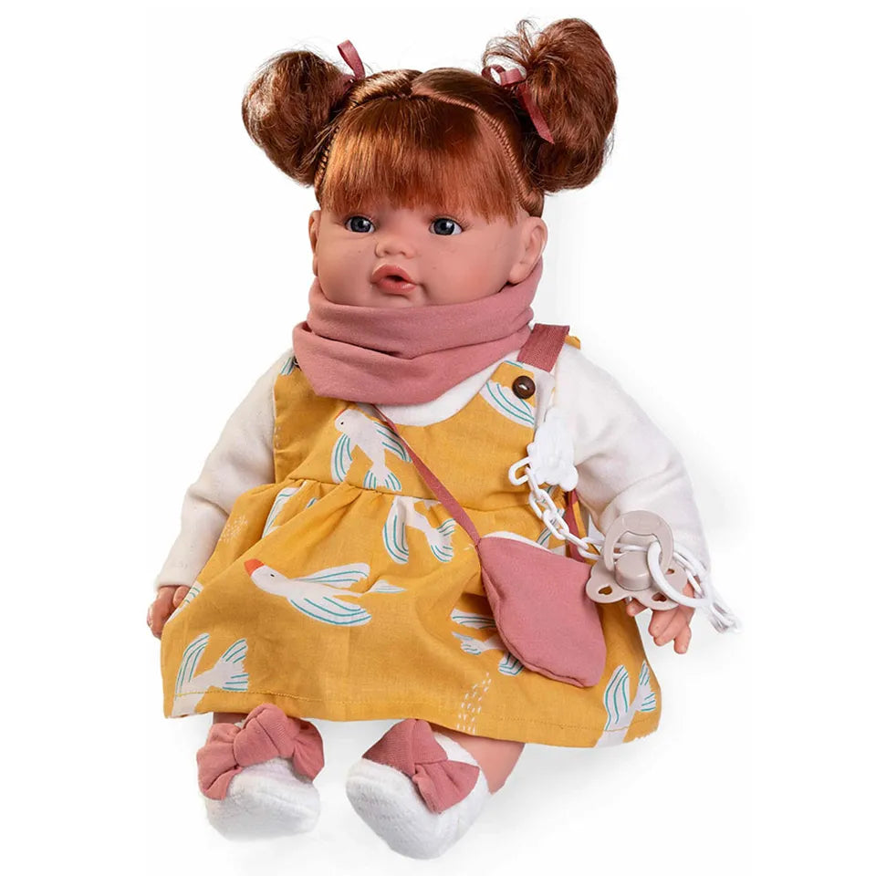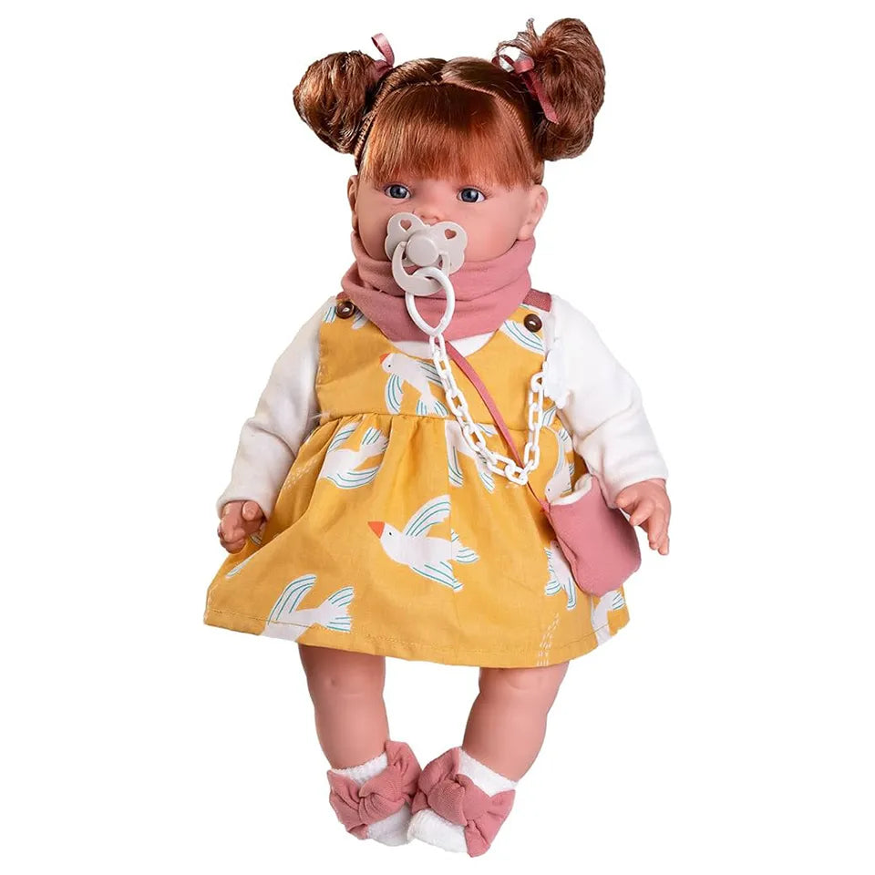 Meet Beni Lagrimitas, the delightful doll from Antonio Juan! Dressed in a mustard-colored dress with cute birds, Beni is ready for a walk, complete with a matching bag and her charming red hair. This version of Beni features a crying mechanism: when the pacifier is removed, Beni cries and calls for her parents, but once the pacifier is returned, she calms down. Perfect for nurturing and imaginative play, Beni has a soft fabric body ideal for hugs, along with soft vinyl limbs. At 42 cm tall and weighing 661 g, she is perfect for children who enjoy caring and interactive play. Beni is the ideal companion for walks and adventures!