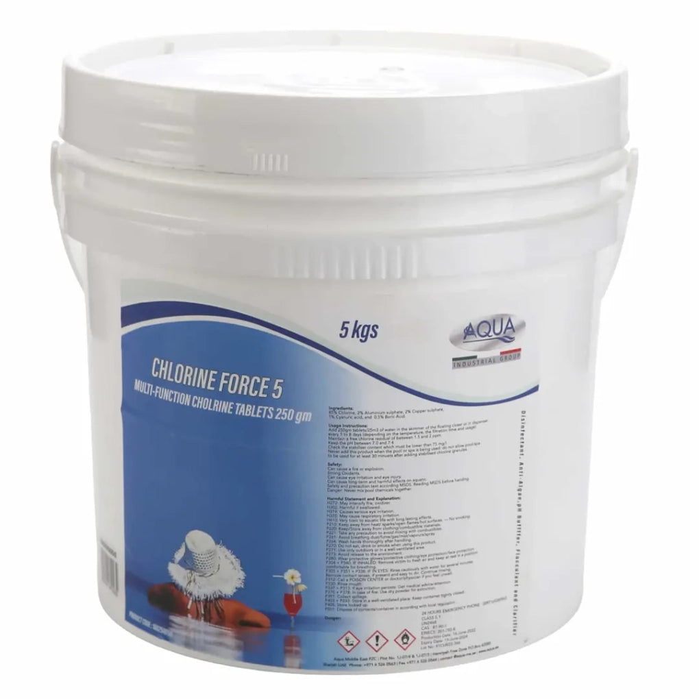 Aqua Chlorine Force5 Tablet 5Kg (250gm tablets). Disinfectant, anti-algae, flocculant, pH buffer, clarifying. 5 regular disinfection actions. Destruction and prevention against algae and their development. Improved filtration by flocculant effect. Effective filtration, proper chlorine level, a proper pH balance, a dash of antialgae, some flocculant to agglomerate the impuritiesForce 5 is the product that definitely simplifies the processing of water.
