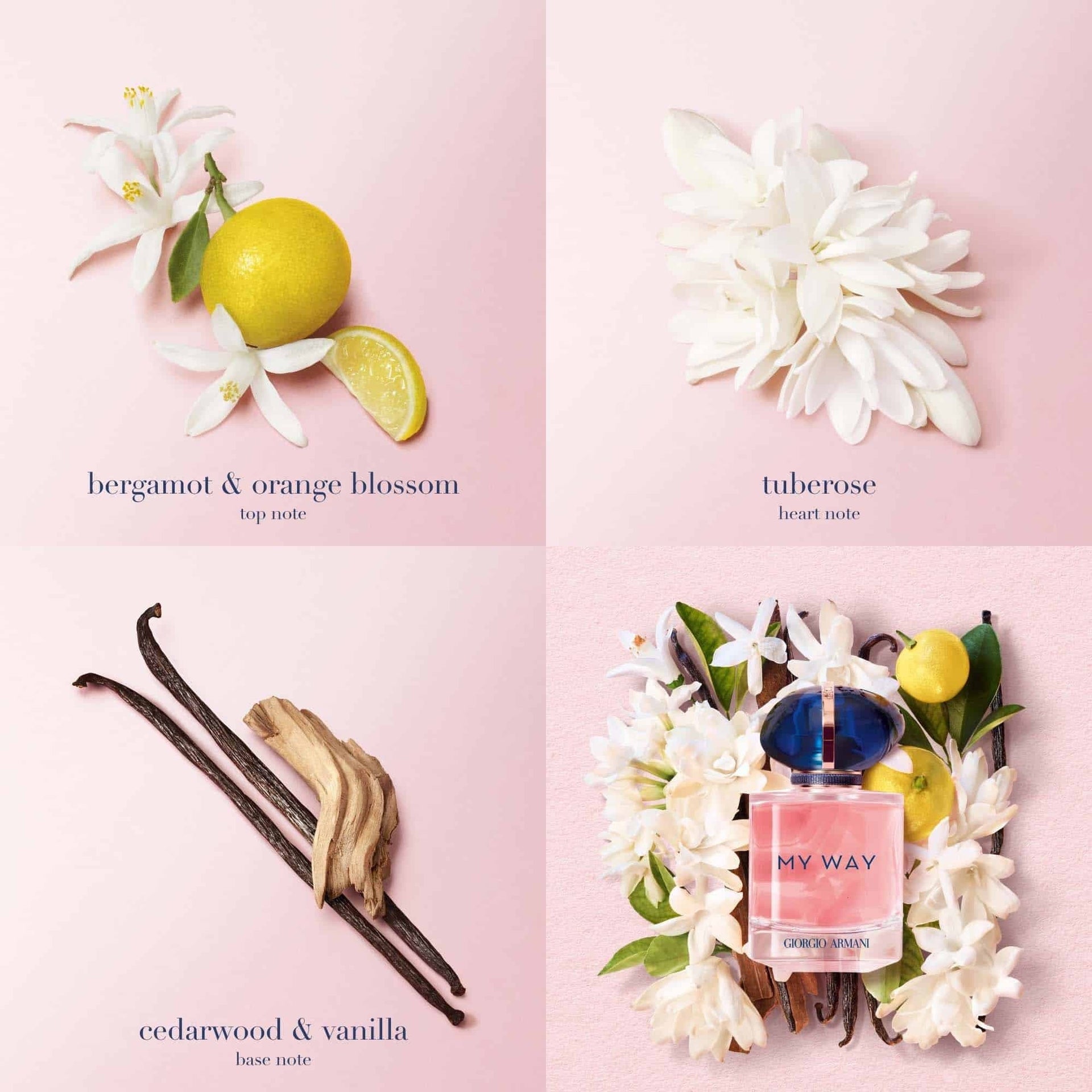 This Giorgio Armani My Way Eau de Parfum is a floral fragrance paying homage to Milan. It blends rose with citrusy and juicy notes of Primofiore lemon, enlightening a majestic Damascena rose, while earthy notes of a modern patchouli turn the aroma into an iconic and elegant chypre accord.