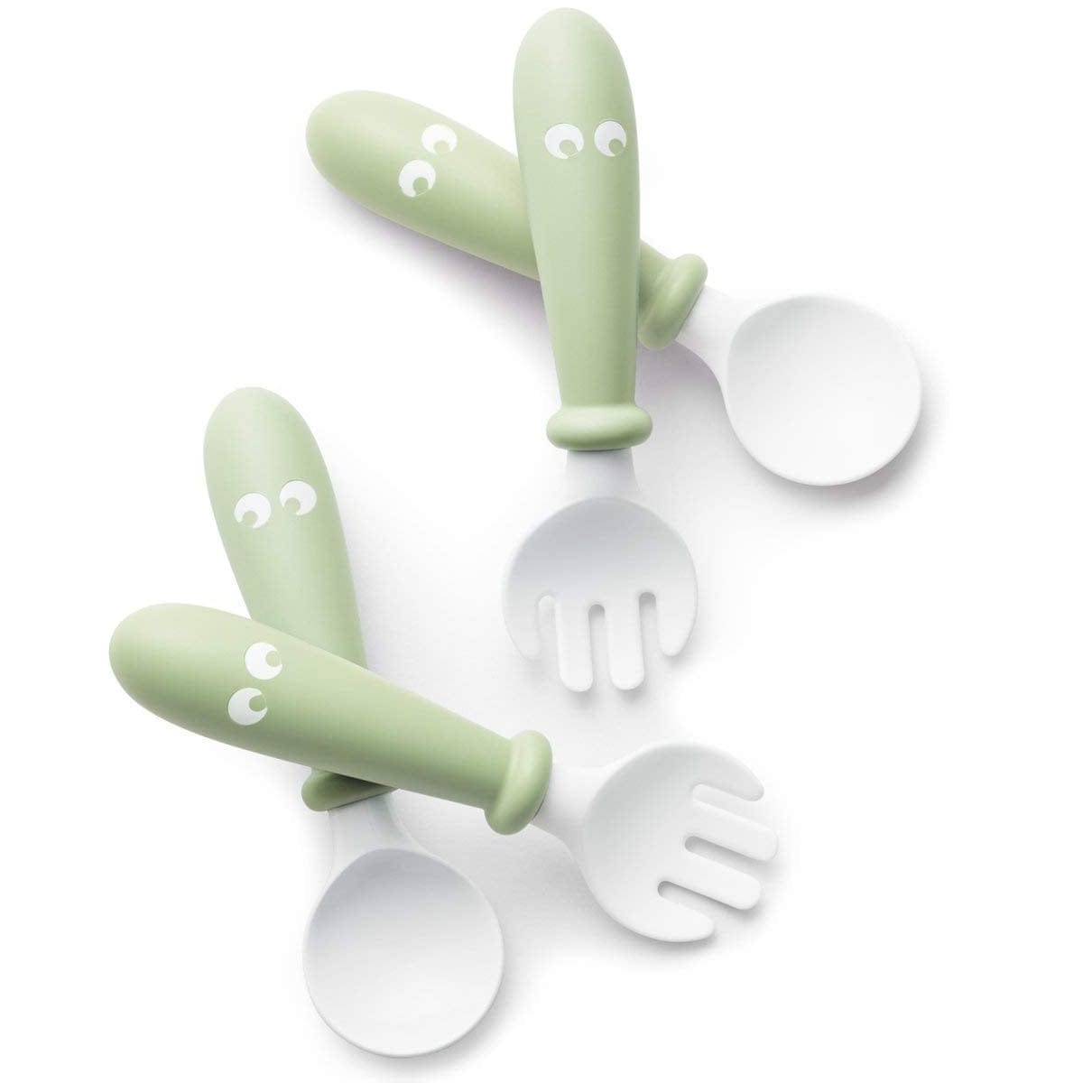 Many children think it's exciting to begin using a spoon and fork to eat, just like their parents. Our baby spoons and forks have short, thick handles that are easy for small hands to grip. They can rest against the edge of the plate without slipping into the food, and a ring at the base of the handle prevents the child's hands from sliding too far down.