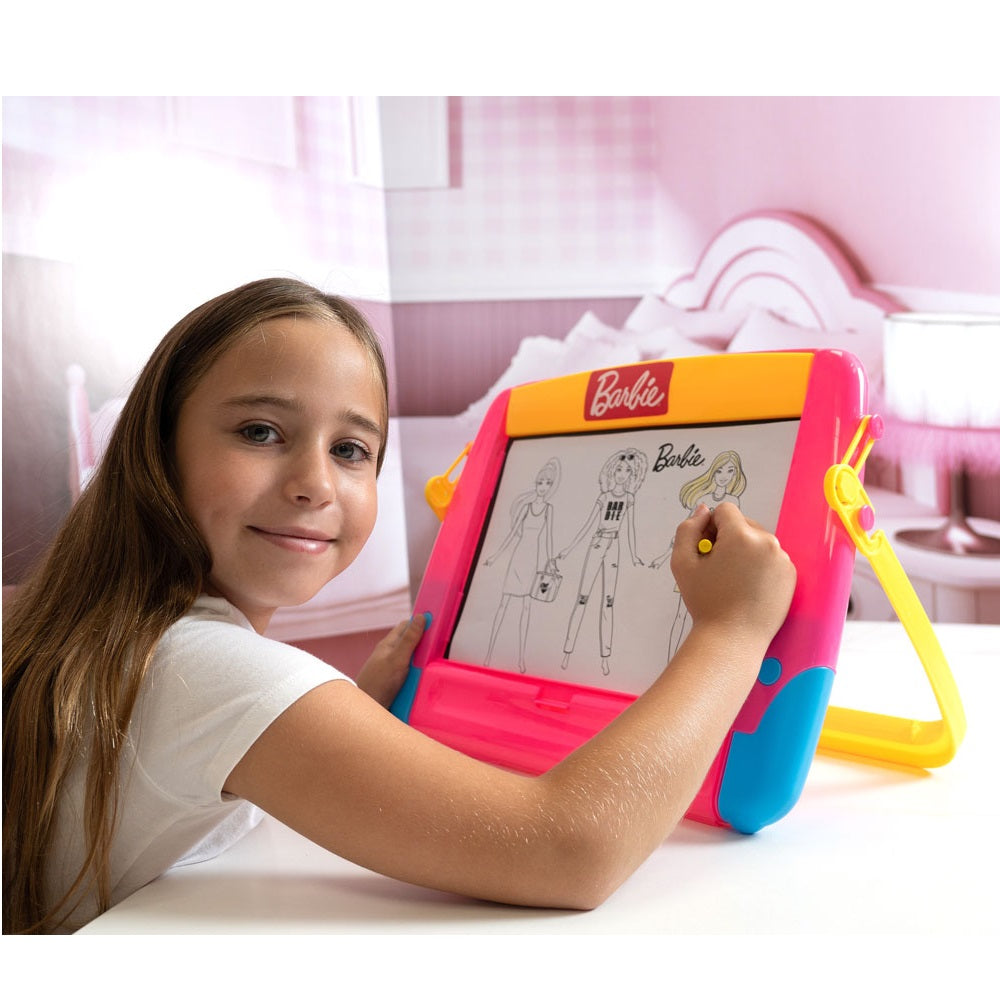 Introducing the exciting 4-in-1 double-sided easel with a convenient carrying handle. This versatile easel features a magnetic whiteboard on one side for attaching paper and a pre-printed plate on the other side for creating Barbie-themed designs. Children can unleash their creativity and enjoy hours of fun with their favorite Barbie character. This creative easel is a great alternative to digital screens, offering a hands-on experience that promotes drawing, writing, and imaginative play. It comes with 4 coloring posters, chalk, and colored pencils, providing everything kids need to express themselves and develop their artistic skills. Perfect for sparking creativity and learning in young children.