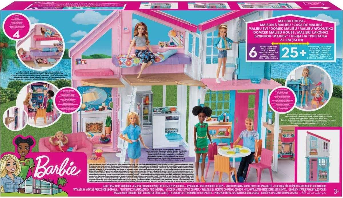 This portable Barbie® townhouse encourages imaginations to move right in with cool transformations and lots of storytelling pieces. Open to reveal a two-story dollhouse with so many play spaces and double-the-fun features! The living room converts to a home movie theatre, a smoothie bar pops up in the kitchen and a bunk bed surprises with room for guests. Classic features are there, too: the bathroom has a toilet with sink, shower and working lid on the toilet; the fridge and oven open in the kitchen; and a fence piece sports a grill decal to bring the play outside. Additional furniture (like a table and chair) and smaller accessories (like place settings and a game board) engage kids in storytelling and exploration. Some pieces have handles a doll can hold and/or are designed with plug-and-play features that make it easy to clean up, close and go. Doll not included.