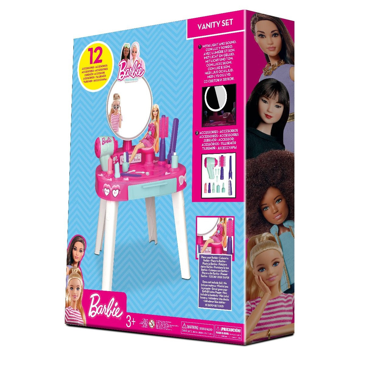 BARBIE VANITY COMES WITH 12 ACCESSORIES: 1 hair dryer, 2 lipsticks, 2 hair pins, 2 bottles, 1 comb, 2 brushes, 1 ring, 2 curling irons With a light and sound function, as well as a seat for Barbie (doll not included).