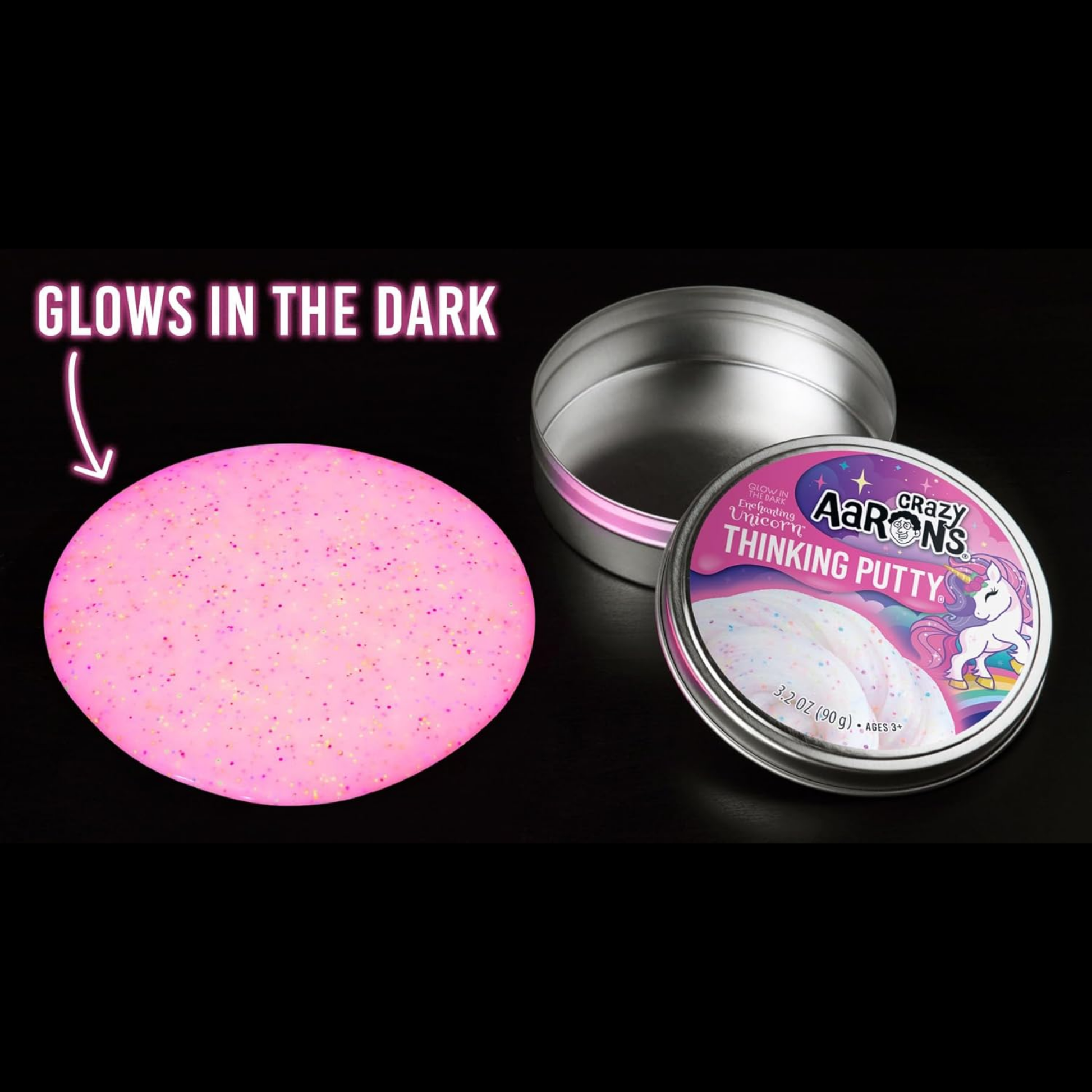 A mythical symbol of beauty and strength, the unicorn has fascinated people throughout the ages. Believe in magic with Enchanting Unicorn Thinking Putty. It charms with a rainbow of neon confetti, shines with golden glitter, and glows a pretty pink in the dark.