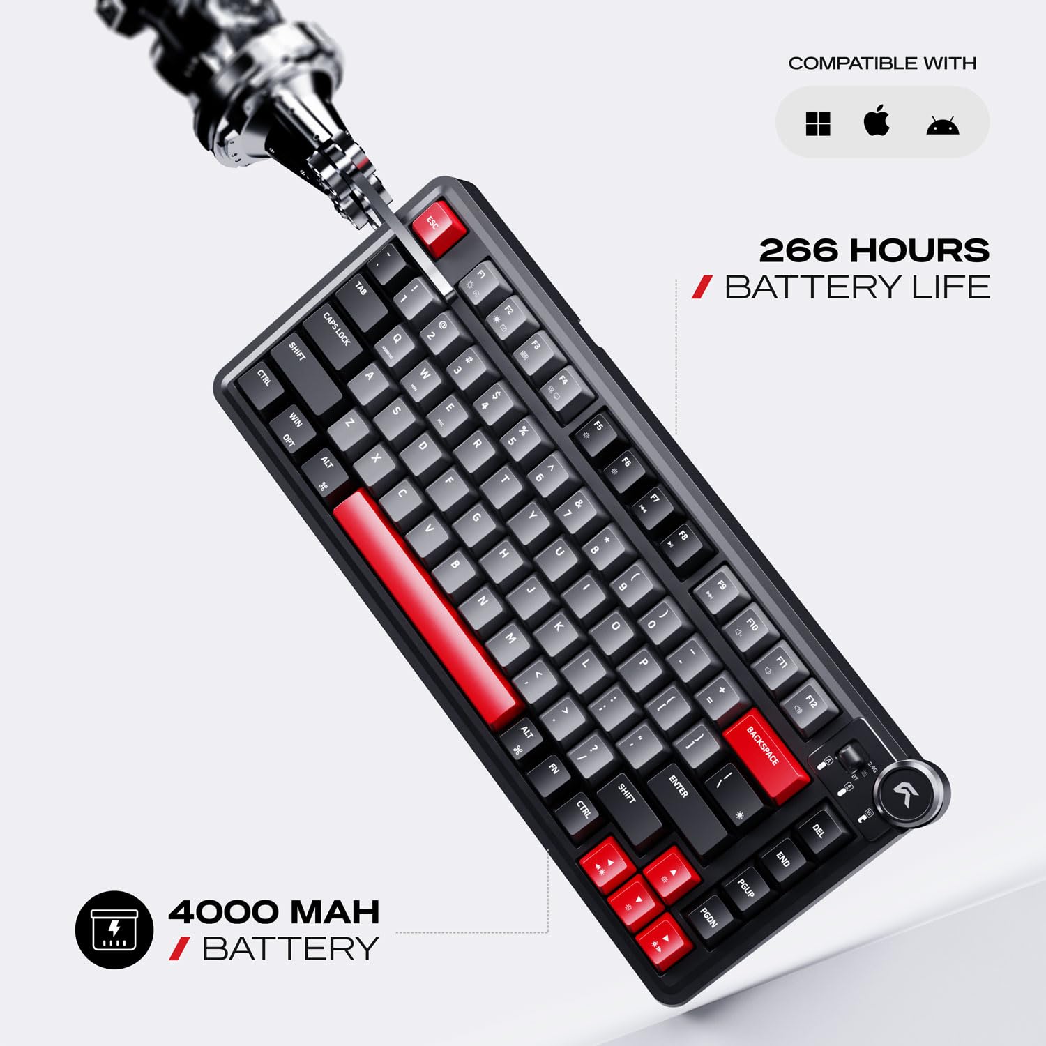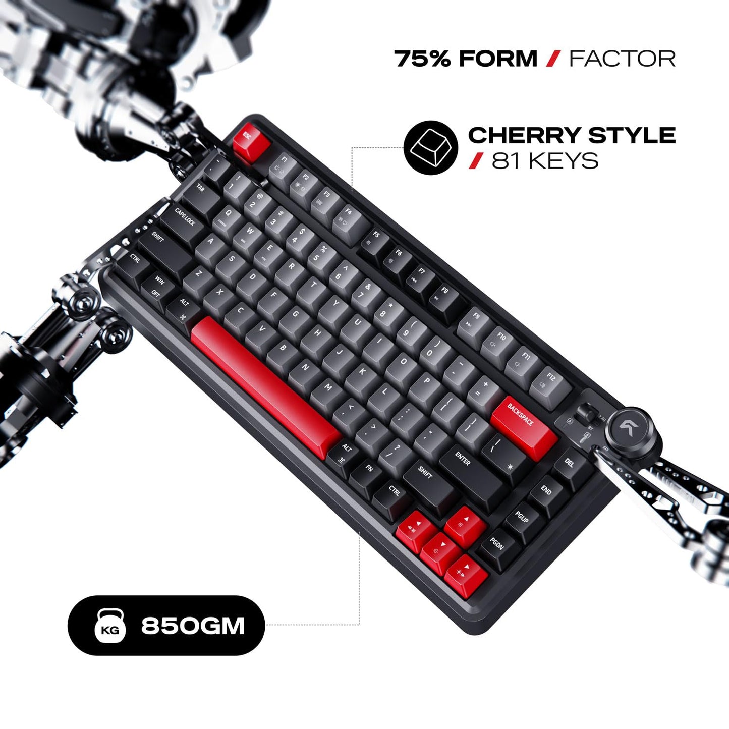 • FORM FACTOR: A Tri Mode connectivity (Bluetooth 5.1 / 2.4Ghz Wireless, USB) enabled 75 % layout with 81 keys and a dedicated volume knob, designed for efficiency and quick media control. Premium ABS bezel frame for strength, stability, lightweight durability and sleek aesthetics.