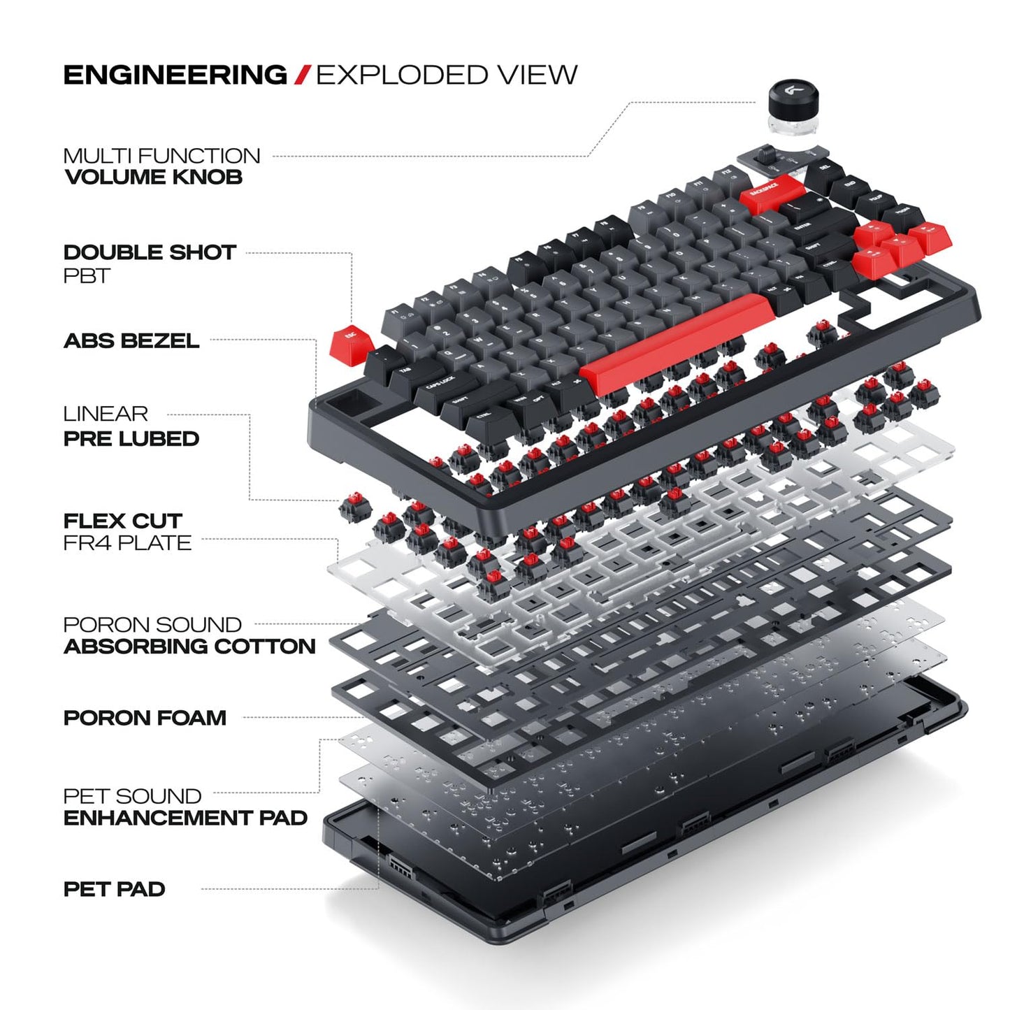 • GASKET ENGINEERING: 5-layer gasket-mounted design with Poron and IXPE foams for sound dampening and a soft, cushioned typing feel. Internally dampened layers minimize resonance, suppress echo, producing rich, muted “thock” acoustics and quieter typing.