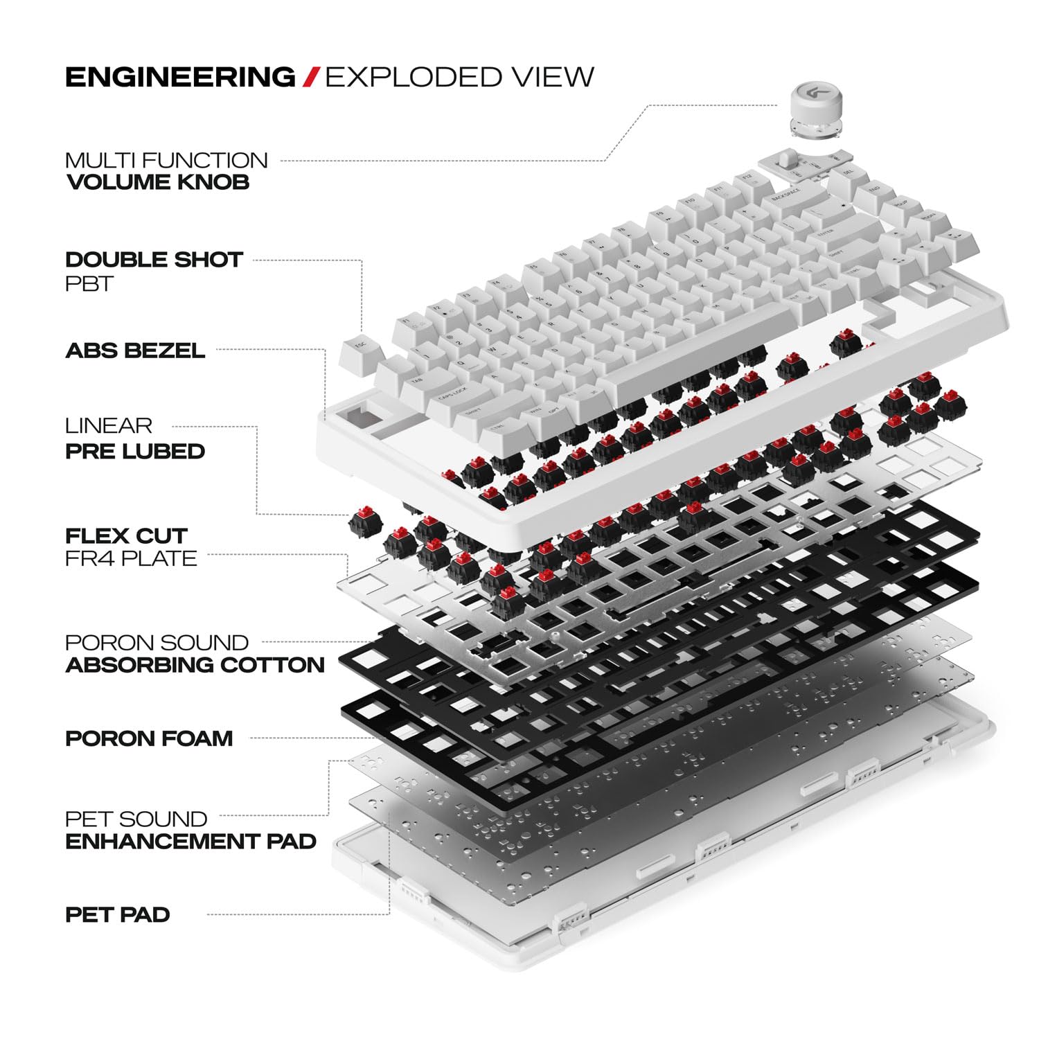 GASKET ENGINEERING: 5-layer gasket-mounted design with Poron and IXPE foams for sound dampening and a soft, cushioned typing feel. Internally dampened layers minimize resonance, suppress echo, producing rich, muted “thock” acoustics and quieter typing.