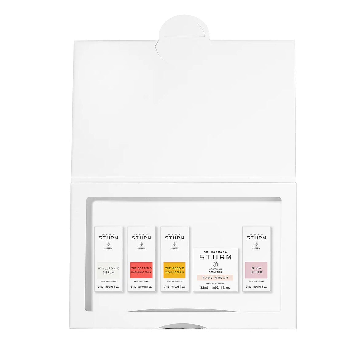 Dr. Barbara Sturm's STURMGLOW ™ STARTER SET is the perfect starter kit for those who are new to STURM or simply if you want to try something new. The kit contains five Dr. Sturm essentials in try out sizes, and provides instant hydration, soothes irritation, balances skin tone and refines the appearance of pores for a healthy, radiant complexion.