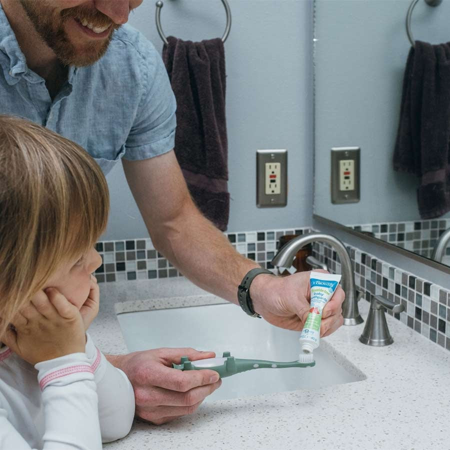 Nothing but clean teeth! Dr. Brown's Natural Baby toothpaste safely and effectively cleans. No fluoride. No artificial flavors, colors, or preservatives. No worries if swallowed. Our natural baby toothpaste is a wholesome way to help your baby learn good dental hygiene. Plus, they'll love the real flavors of strawberry! Just add a pea-sized drop to an extra-soft bristled brush and with your help and supervision, teach them to use small circular motions on their teeth and gums, twice a day every day. Never leave your child unattended with toothbrush or toothpaste. . Help baby learn good dental hygiene Safe TO swallow, Fluoride-free Toothpaste Has no Artificial flavors, colors, or preservatives Real strawberry flavor babies love Use pea-size drop and brush in small, circular motions on teeth and gums twice a day