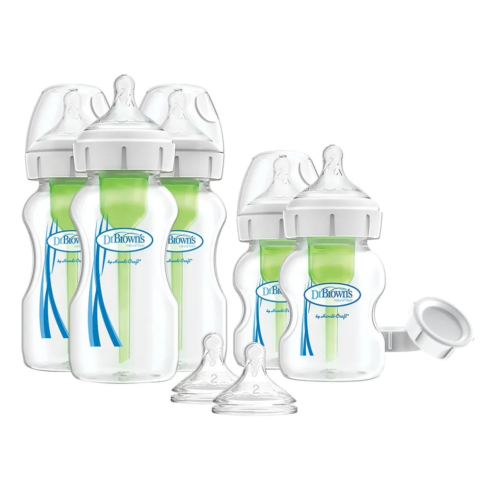 The Dr Brown's Options+ Wide Neck Feeding Set contains all the bottles necessary to feed your child. The bottles use the Options venting system which is designed to reduce colic, burping and trapped air. It is also proven to help preserve levels of vitamins A, C and E in breast milk by reducing air bubble oxidation of milk. The unique internal vent system allows air to enter through the teat collar, preventing air bubbles or vacuum formation inside the bottle. The air is then channelled to the areas above the liquid. The absence of internal vacuum makes it easier for baby to feed comfortably
