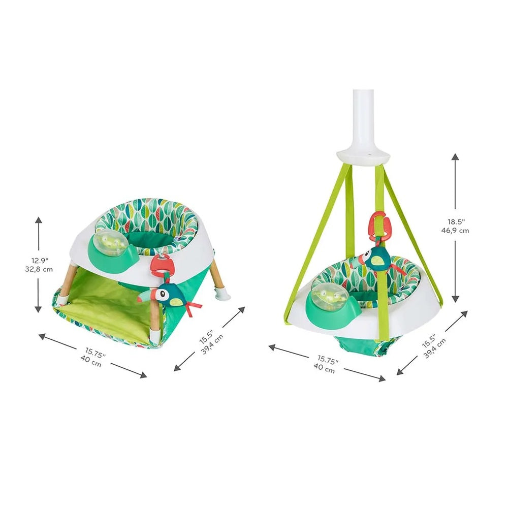 Give your little one more play time with two stages of fun! The ExerSaucer Tiny Tropics easily converts from a baby activity seat to doorway jumper - no tools needed! The baby activity seat's wood accents and modern design compliment your home decor, while two interactive toys entertain baby in both seat and jumper modes! , , Tiny Tropics is quick to set up and transition from baby activity seat to doorway jumper and all the parts needed are included. Simply click the wood legs, with pre-assembled mat, into the tray and add the plush toucan toy to set up the baby activity seat in two easy steps. To convert to the doorway jumper, release the wood legs and click in the hanging straps. It's that easy! The soft and supportive baby activity seat encourages your child to sit up, and the seat pad is removable and machine-washable. The doorway jumper provides bouncing entertainment for your child and features an easy-to-use clamp and adjustable straps that can be set at different heights as they grow!