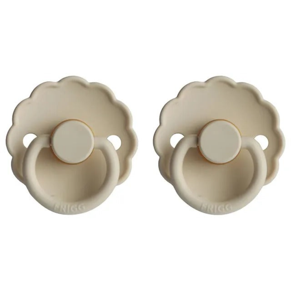 The FRIGG Daisy pacifier with scalloped edges that mimic flower petals is the essence of elegant design. The flowery and modern details catch the eye of every style-conscious mother. That makes FRIGG the perfect fit for today's mothers who attach great importance to classic designs with modern twists when choosing baby essentials. , , FRIGG Daisy is available in two sizes: , Size 1: Nipple is 27 mm and is recommended for ages 0-6 months. , Size 2: Nipple is 30 mm and is recommended for ages 6-18 months.