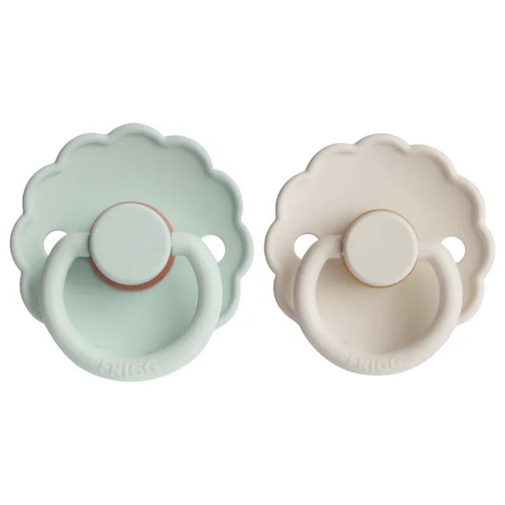 The FRIGG Daisy pacifier with scalloped edges that mimic flower petals is the essence of elegant design. The flowery and modern details catch the eye of every style-conscious mother. That makes FRIGG the perfect fit for today's mothers who attach great importance to classic designs with modern twists when choosing baby essentials. The FRIGG Daisy pacifier full of charm is available in both monochrome and mixed colors. , , Care instructions for FRIGG pacifiers: Place the pacifier in a bowl and pour it with boiling water. Let it soak for 3-5 minutes. Do not submerge for longer than 5 minutes. Remove and place on a flat surface to air dry. Do not use sterilizers, microwaves, or dishwashers. For optimal safety and hygiene, we recommend discarding the pacifier after 1-2 months of consistent use. Always check the pacifier before use, and discard at first signs of damage or wear.