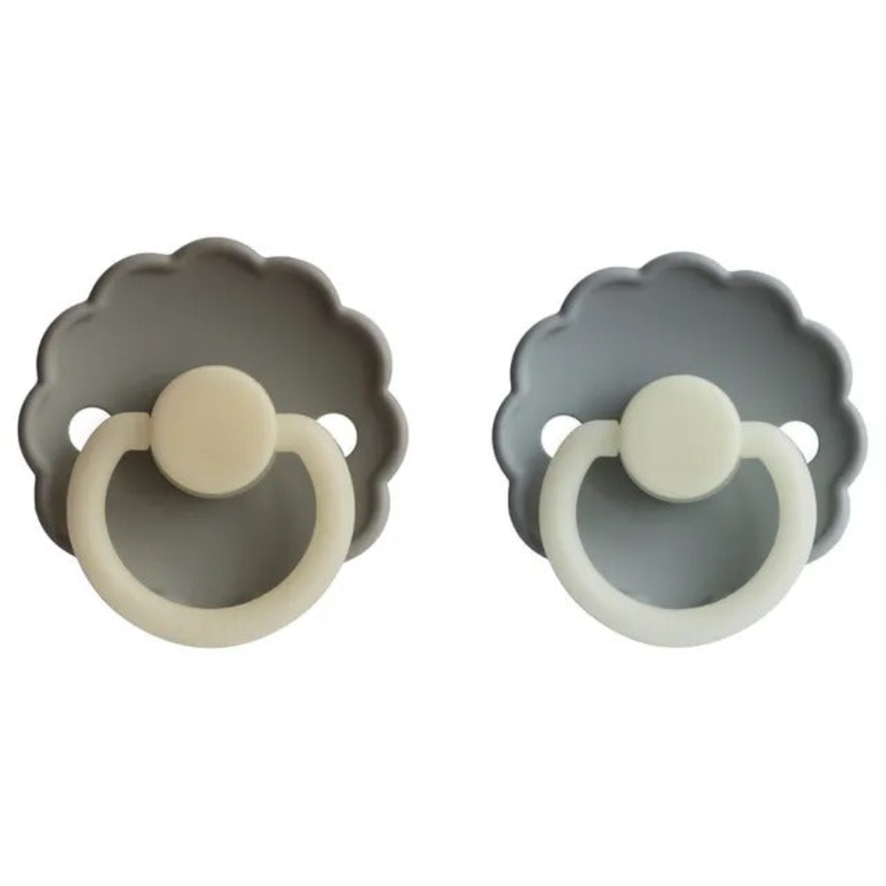 FRIGG Night pacifier with a glow-in-the-dark function. The handle and knob will glow in the dark and solve the challenge of finding and placing your baby's pacifier in the middle of the night. The glow-in-the-night feature is softly bright and won't harm your baby's eyes and you can easily find the pacifier without turning on the lights. , , The FRIGG Daisy pacifier with scalloped edges that mimic flower petals is the essence of elegant design. The flowery and modern details catch the eye of every style-conscious mother. That makes FRIGG the perfect fit for today's mothers who attach great importance to classic designs with modern twists when choosing baby essentials. The FRIGG Daisy pacifier full of charm is available in both monochrome and mixed colors. , , How to make the FRIGG Night pacifier glow: Hold the pacifier in light to activate the glow function.