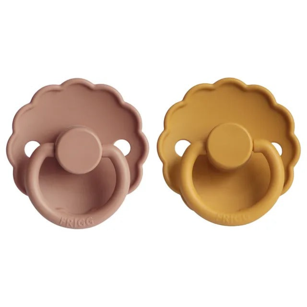 The FRIGG Daisy pacifier with scalloped edges that mimic flower petals is the essence of elegant design. The flowery and modern details catch the eye of every style-conscious mother. That makes FRIGG the perfect fit for today's mothers who attach great importance to classic designs with modern twists when choosing baby essentials. , , FRIGG Daisy is available in two sizes: , Size 1: Nipple is 27 mm and is recommended for ages 0-6 months. , Size 2: Nipple is 30 mm and is recommended for ages 6-18 months.