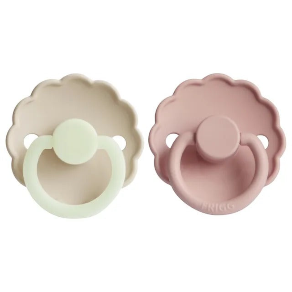 FRIGG Night pacifier with a glow-in-the-dark function. The handle and knob will glow in the dark and solve the challenge of finding and placing your baby's pacifier in the middle of the night. The glow-in-the-night feature is softly bright and won't harm your baby's eyes and you can easily find the pacifier without turning on the lights. , , The FRIGG Daisy pacifier with scalloped edges that mimic flower petals is the essence of elegant design. The flowery and modern details catch the eye of every style-conscious mother. That makes FRIGG the perfect fit for today's mothers who attach great importance to classic designs with modern twists when choosing baby essentials. The FRIGG Daisy pacifier full of charm is available in both monochrome and mixed colors. , , How to make the FRIGG Night pacifier glow: Hold the pacifier in light to activate the glow function.
