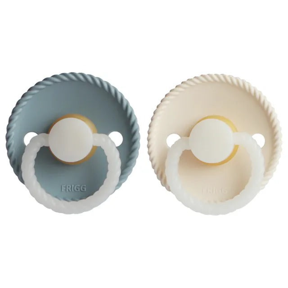 FRIGG Night pacifier with a glow-in-the-dark function. The handle and knob will glow in the dark and solve the challenge of finding and placing your baby's pacifier in the middle of the night. The glow-in-the-night feature is softly bright and won't harm your baby's eyes and you can easily find the pacifier without turning on the lights. , , FRIGG Night pacifier is 100% designed and manufactured in Denmark as the only pacifier brand in the world. How to make the FRIGG Night pacifier glow. Hold the pacifier in light to activate the glow function. , , Care Instructions - Place the pacifier in a bowl, and pour boiling water overtop. Let sit for 3-5 minutes. Do not submerge for longer than 5 minutes. Remove and place on a flat surface to air dry. Do not use sterilizers, microwaves or dishwashers. For optimal safety and hygiene, we recommend discarding your pacifier after 1-2 months of consistent use. Always check your pacifier before use, and discard at first signs of damage or wear.
