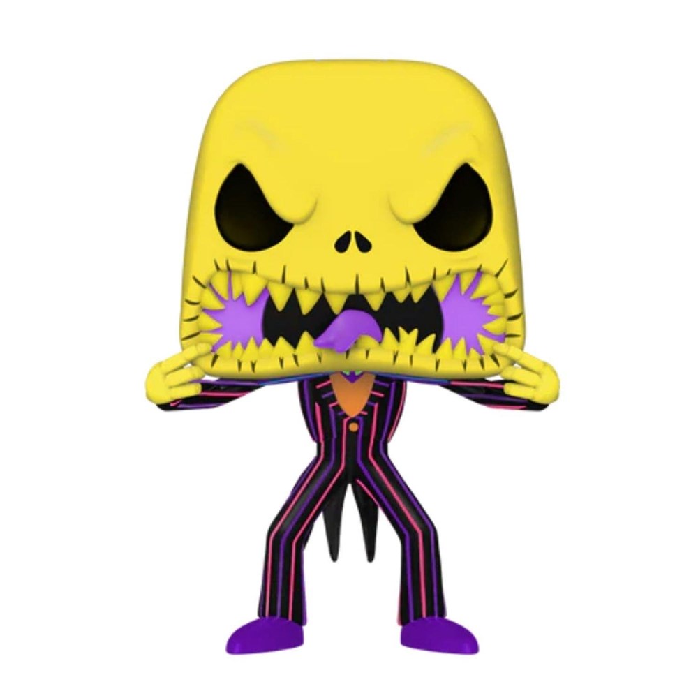 Scary Face Jack from The Nightmare Before Christmas is featured in this Pop! figure, showcasing his eerie and iconic look. This exclusive figure adds a spooky touch to any collection.