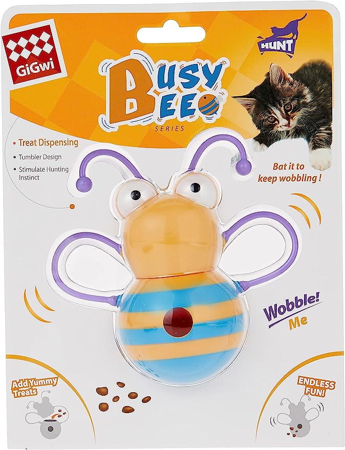 Enhance your feline friend's playtime with the Gigwi Busy Bee Treat Dispenser Cat Toy. Made with durable materials, this toy dispenses treats as your cat plays, stimulating their natural hunting instincts. Keep your cat entertained and satisfied with this interactive toy.