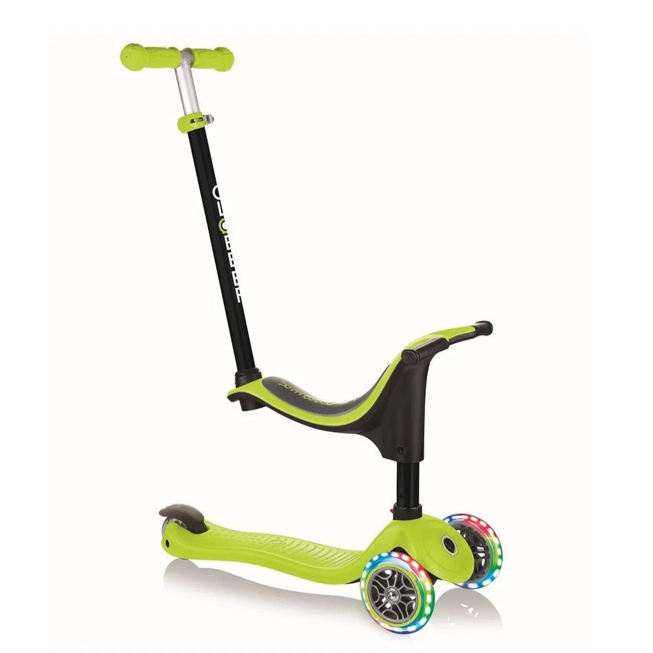 Wheels - Children's scooter with a seat and luminous wheels that flash red, blue and green when driving in a gurney, balance bike or scooter mode