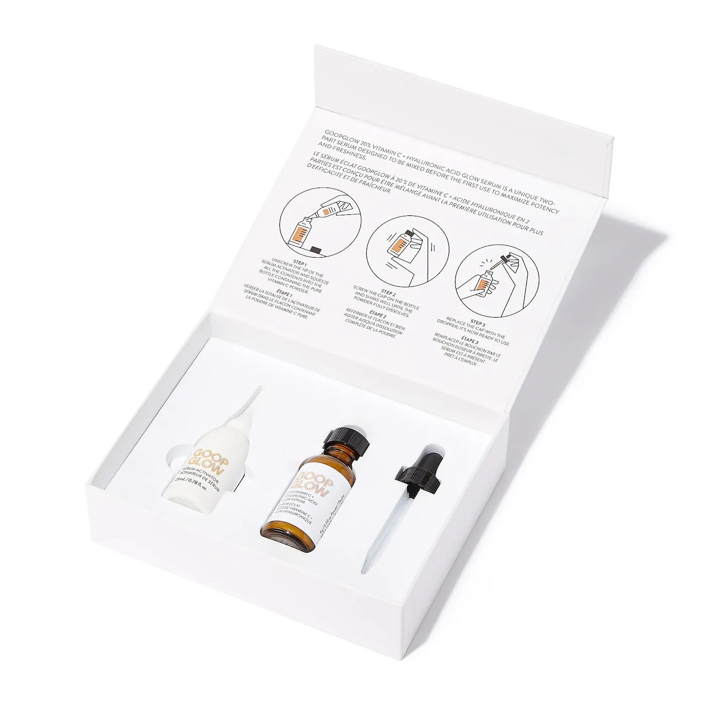 This daily glow serum combines two skin-care powerhouses, L-ascorbic acid (proven in research to be the purest, best-for-skin form of the antioxidant vitamin C) and moisturizing hyaluronic acid (a hydrator that's naturally present in the body). The unique two-part design maximizes potency and freshness, delivering a serum that stays active all the way through its use. Before your first use, mix the super potent 20% vitamin C powder with the hyaluronic acid serum. (There are three different molecular sizes of hyaluronic acid present to penetrate different layers of the skin, as well as the antioxidant superfruit Australian kakadu plum.) The ingredients work synergistically to help brighten the appearance of the skin, significantly improving its firmness, tone, texture, and hydration and leaving it looking radiant, luminous, and healthy.