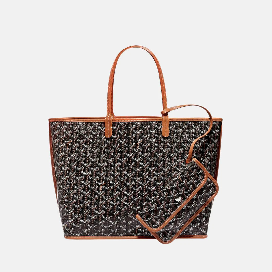 The Goyard Anjou PM Tote in Black & Tan remakes classic French craftsmanship with contemporary utility. Crafted in France from luxurious Chevroches calfskin and iconic Goyardine canvas, this reversible medium tote features a sleek black canvas exterior and warm tan leather interior. Elegant palladium hardware and durable 17 cm rolled leather handles provide comfort and polish. Sized at 33 cm × 14.5 cm × 28 cm and weighing just 420 g, it’s perfectly balanced for daily city life—from work errands to leisurely weekends. Fully reversible with a matching detachable pouch, it offers versatile style fused with timeless sophistication.