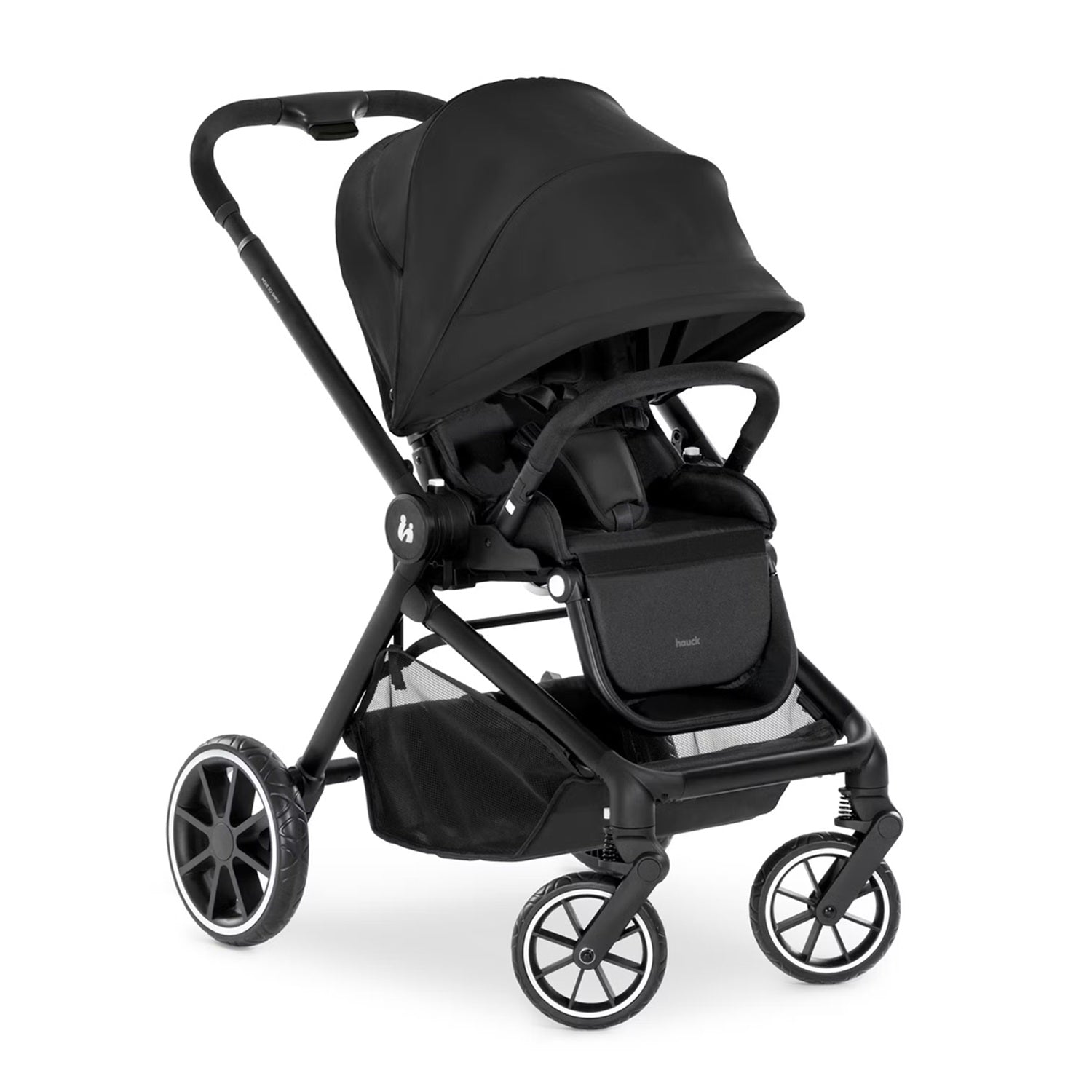 When using the pushchair, your child can face towards you or the street. The peek-a-boo window allows for eye-contact as well as fresh air. For sleeping, you can recline the backrest to a lie-flat position and adjust the footrest upwards. For transport, you can fold the carrycot flat and the pushchair with one hand. By means of adapters, you can combine the frame with an infant car seat by hauck or other manufacturers. The hauck raincover or seat liner are also available as accessories.