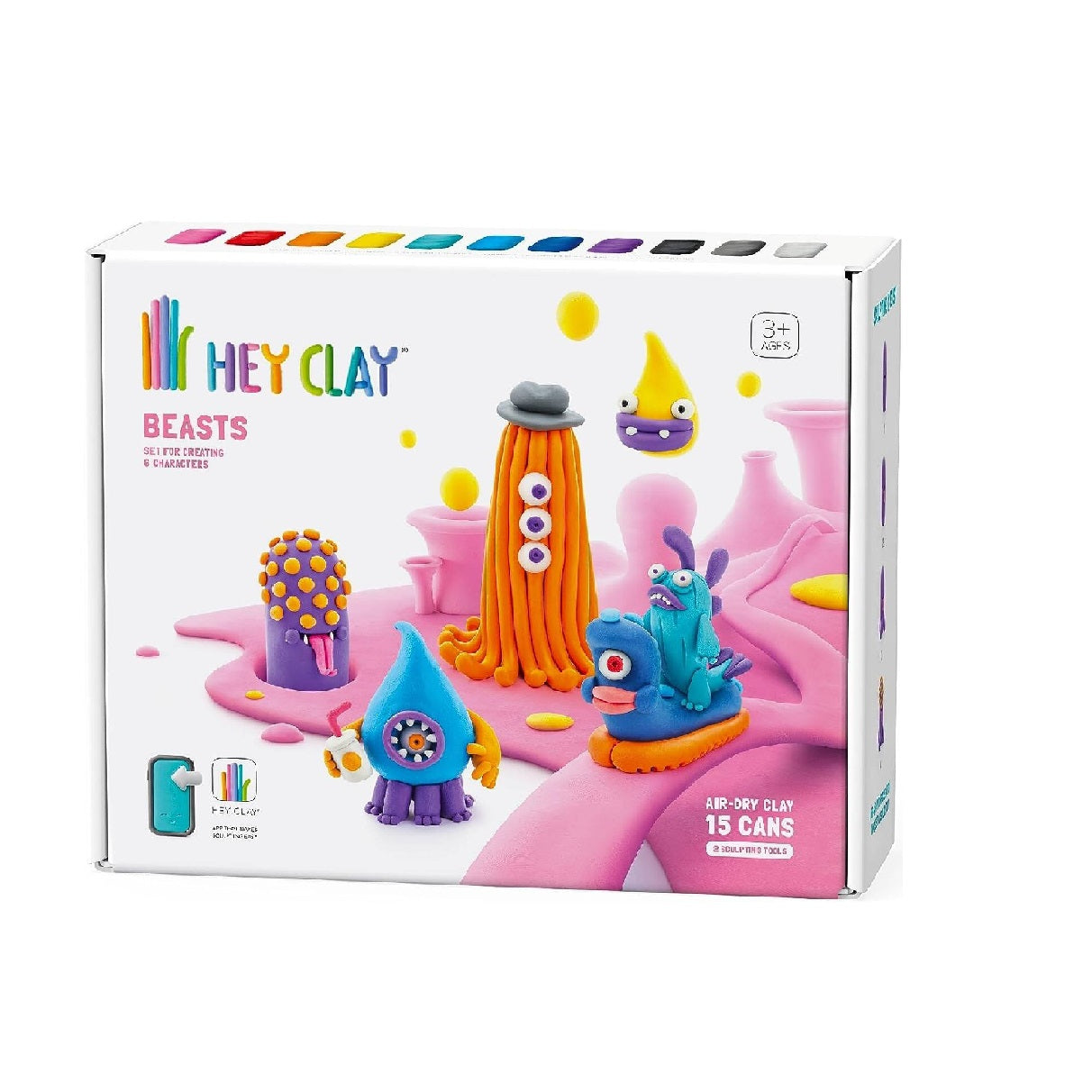 Unleash endless opportunities for creativity with HEY CLAY - Beasts 15 Cans! This vibrant and pliable modeling clay encourages sensory development and play-based learning, while enhancing fine motor skills and sparking imagination. Mold it into popular characters, trendy toys, decor pieces, fashion accessories, or unique installations. This adorable set will keep your child entertained for hours on end. The clay also air dries and hardens, allowing your child to preserve their creations for future playtime.