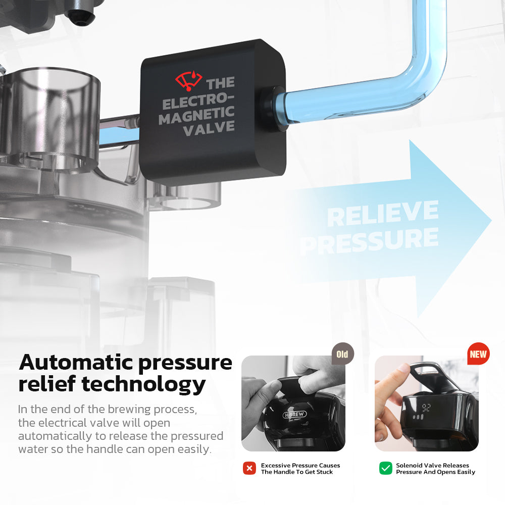 in the end of the brewing process, the electrical valve will open automatically to release the pressured water so the handle can open easily
