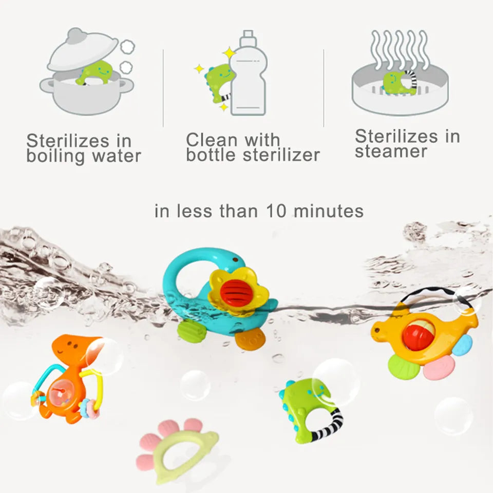 The Hola Dinosaur Rattles and Teethers are very easy to clean. Simply, place the items in boiling hot water for 3-5 minutes and then use a clean cloth to dry them. Each rattle contains a drain hole to get rid of excess water, helping rattles to dry quicker.