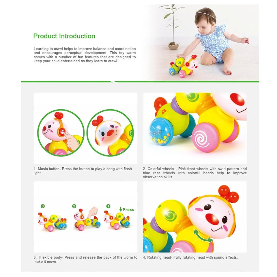 • The lights flash with music, which can enhance the worm's vitality and dynamism to stimulate baby's playing interest.