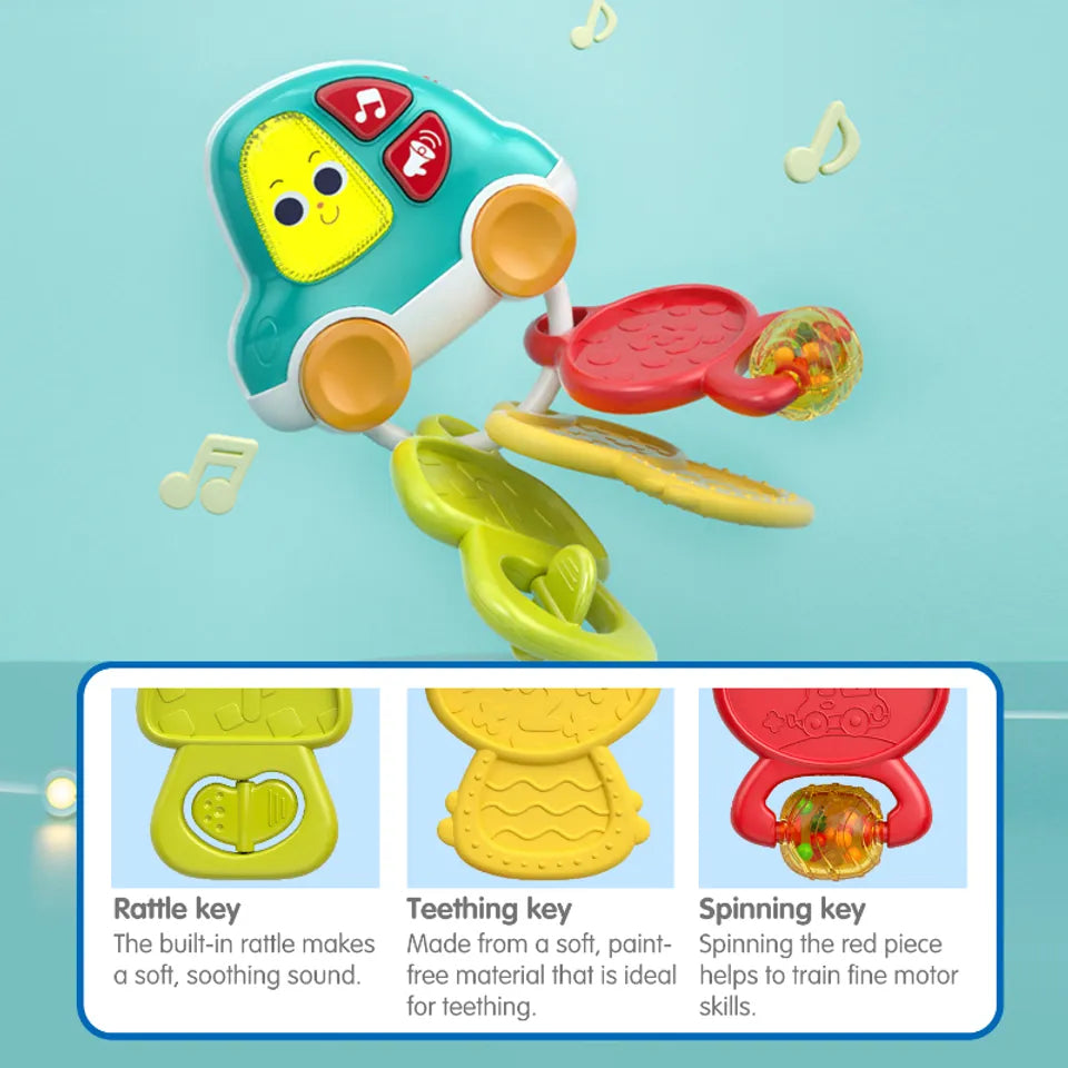 The Hola Musical Car Keychain is a fun and educational toy designed for babies. It features a cute car-shaped "keychain" with three brightly coloured, functional keys that act as a spinning key, rattle key, and teething key. The car itself has musical buttons that play a variety of sounds, including 5 different songs, numerous car sound effects and cartoon sounds.