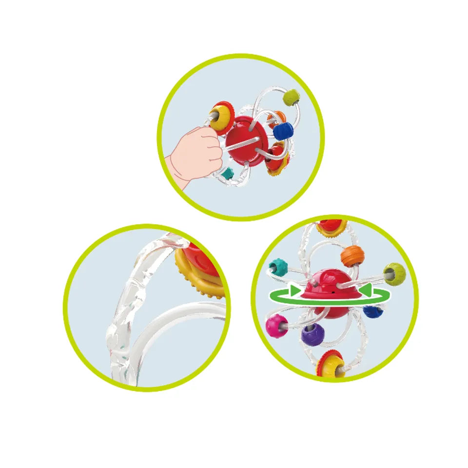 The Hola Planet Catching Ball is an engaging sensory toy, featuring a central red sphere surrounded by flexible tubes with colourful, textured rings. It's perfect for developing grasping skills and hand-eye coordination through playful exploration.