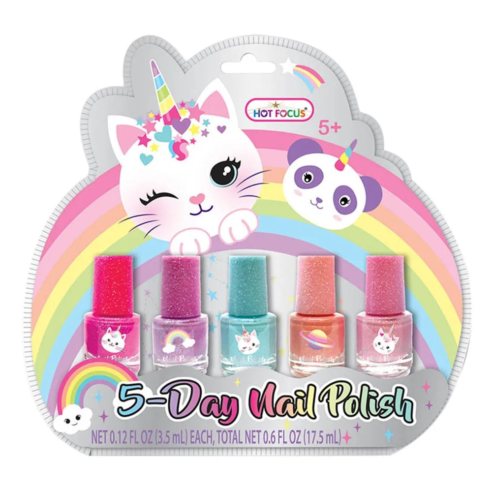 5-Day Nail Polish. The perfect gift for any girl who loves scented sparkly nails. Features scented water-based "peel-off nail polish (no harsh chemicals needed for nail polish removal). Perfect gift for any young girl who loves sparkly nails. Contains 5 scented nail polishes.