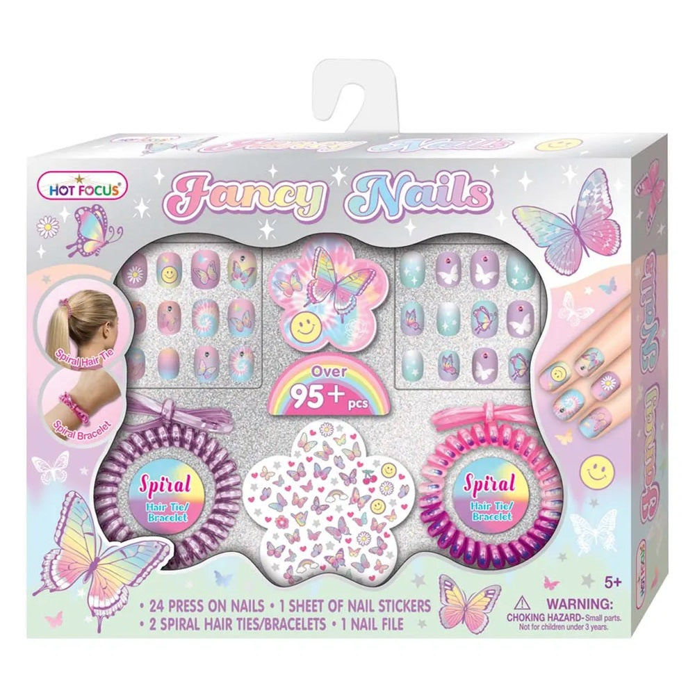 Transform playtime into a dazzling nail art adventure with the Hot Focus Tie Dye Butterfly Fancy Nails Kit! Specially designed for creative minds aged 5 and above, this all-inclusive kit offers a world of imaginative nail fun. Unleash a rainbow of Colours and mesmerizing butterfly designs with our 24-premium press-on nails. These easy-to-apply nails come in various sizes to ensure a perfect fit for every little artist. Each kit also includes a professional-grade nail file for smooth edges and a flawless finish. Enhance your nail art masterpiece with our enchanting assortment of nail stickers, featuring vibrant tie-dye patterns and adorable butterfly motifs. Simply peel, stick, and watch your nails come to life with vibrant, eye-catching details. But that's not all! As a special bonus, we've included 2 versatile spiral hair ties that can also double as trendy bracelets, adding an extra touch of style to your little one's ensemble. Indulge your child's imagination and let their creativity take flight with the Hot Focus Tie Dye Butterfly Fancy Nails Kit. Watch as they dive into a world of Colour and self-expression, one mesmerizing nail at a time. Order now and bring out the budding artist in your little one.