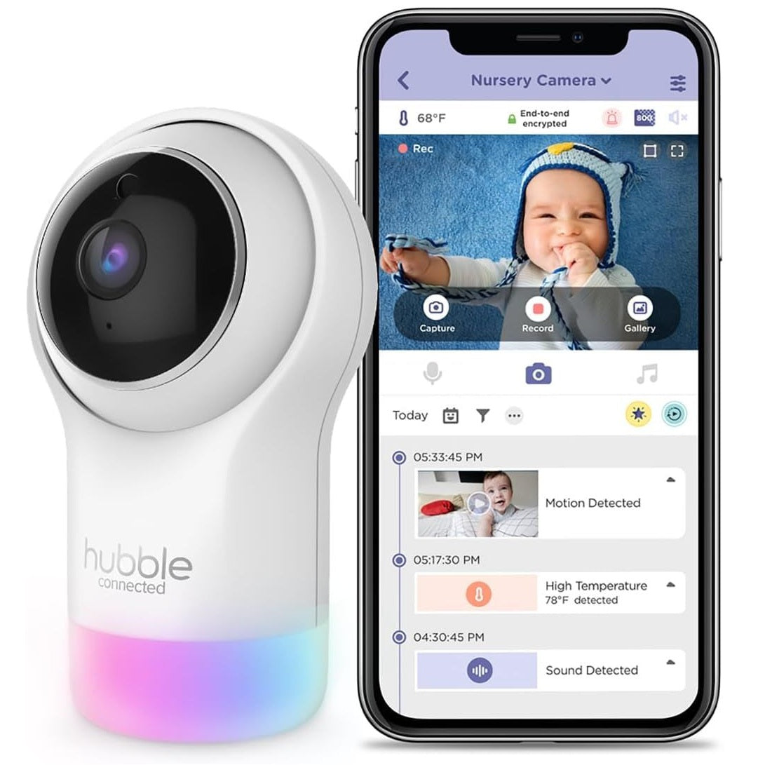 Nursery Pal Glow is a sleek yet simple monitor that offers more parental capabilities than ever before, so you can rest easy knowing your child is safe. Easily observe the reliable HD baby camera feed from your compatible smart device via Wi-Fi Wireless Connectivity. Effortlessly pan, tilt, and zoom to maintain the perfect view of your baby. Use Two-Way Talk to soothe your child with your familiar voice. Ensure their sleep brings peaceful dreams by enabling the soft, 7-color night light on the camera, which also serves as a smart sleep trainer for your baby. You can even track nursery room temperature, monitor in the dark with infrared night vision, and comfort them with preloaded lullabies, soothing sounds, and audiobooks.