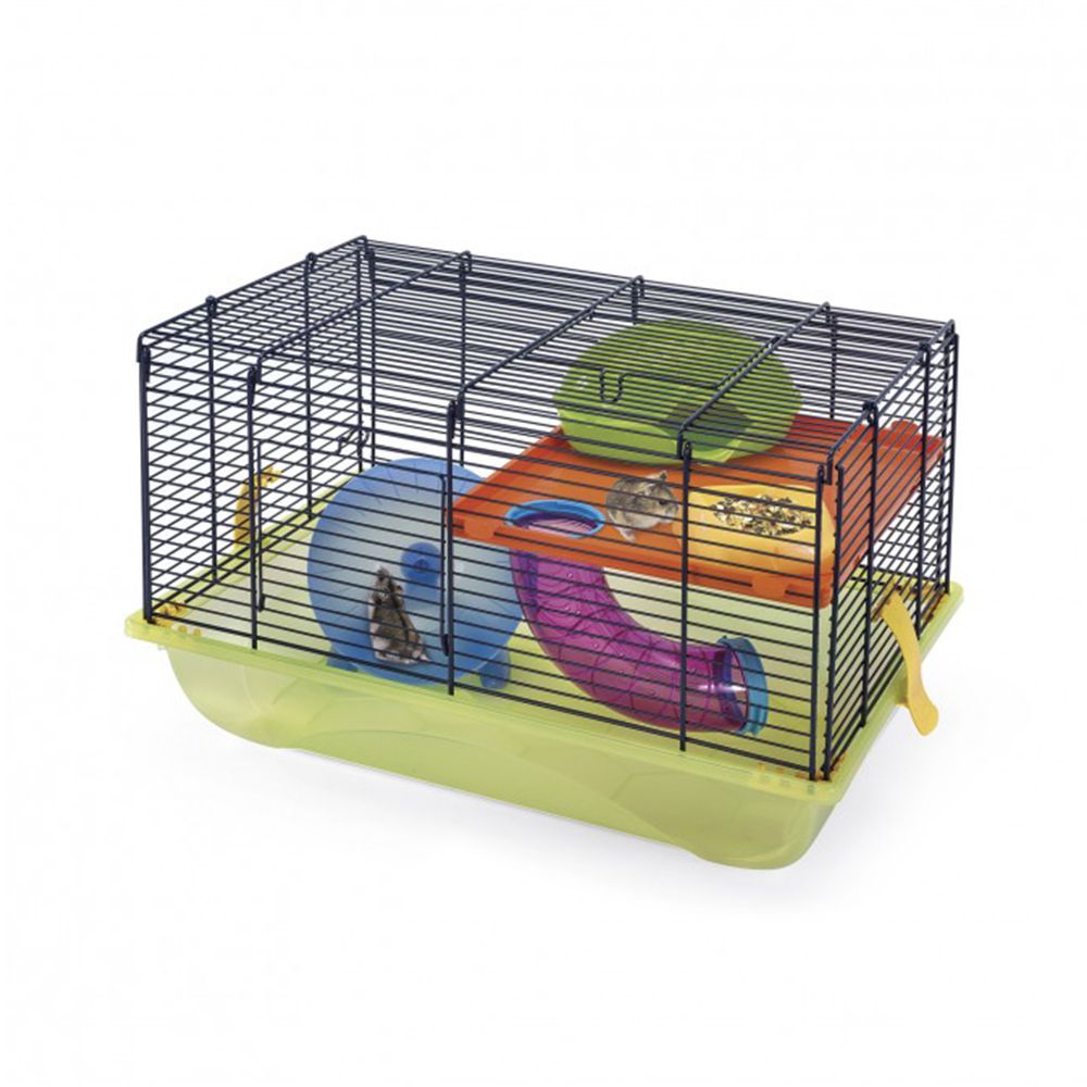 Hamster cage with a green semi-transparent plastic bottom and a blue metal mesh structure. Hooked to the net a shelf connected to the bottom with a tunnel to create more space for your little rodent. The cage is completed by the Hut nest, the Rolly wheel and the Mini Bowl manger, essential accessories to create an environment suited to the needs of your hamster. The opening on the roof with safety hook will allow you to comfortably insert the food and easily reach your pet. Criceti 9 is a cage made with the space-saving system to make you save on transport and storage costs and easy assembly.
