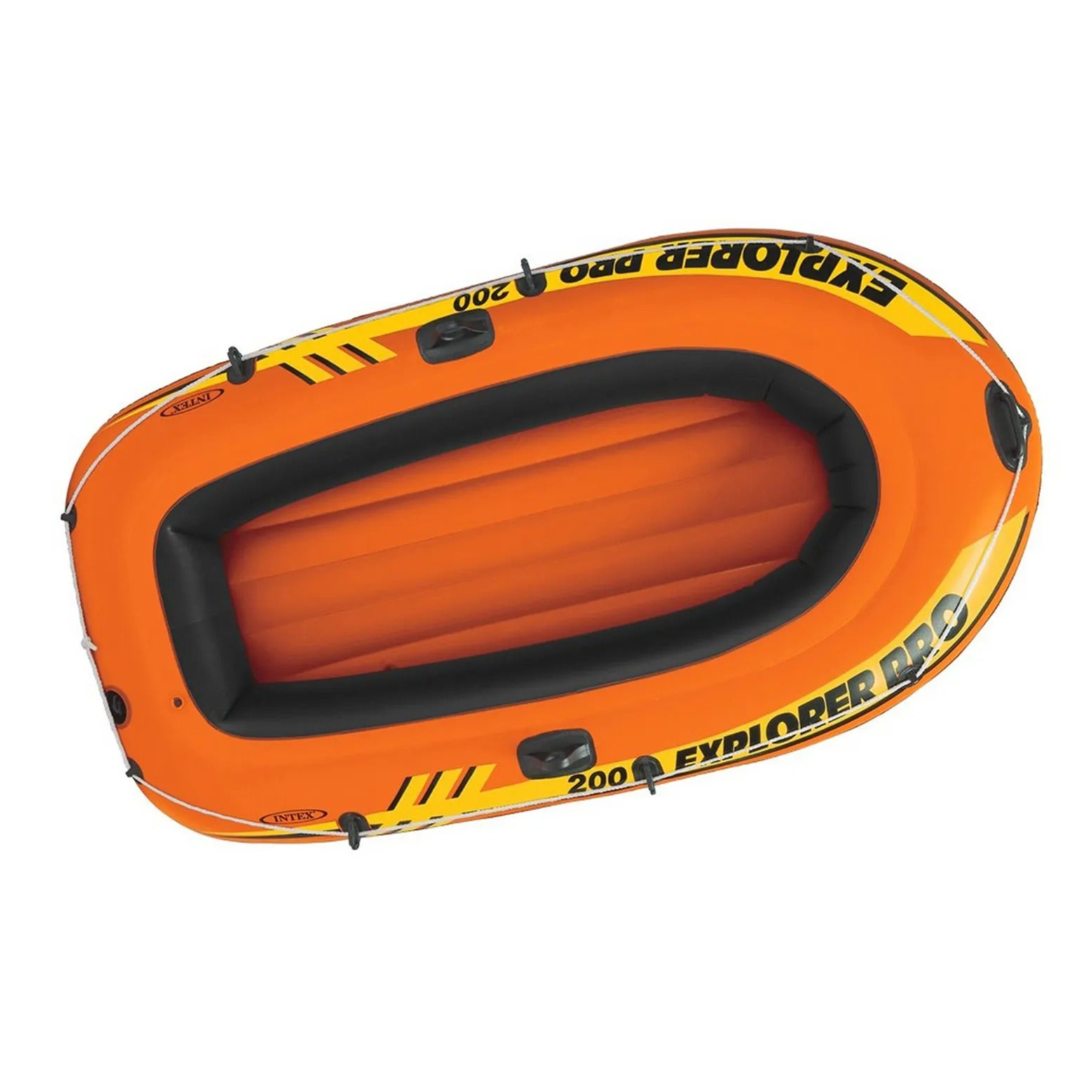 Have a boat race with friends and set the pace with the super fun Intex Explorer Pro 200! This 2-Person, inflatable boat features an all-around grab line, oar locks, grab handle on bow, and a soft inflatable floor for easy cruising. Inflatable boat, french oars and high-output pump All round grab line Grab handle Oar locks.