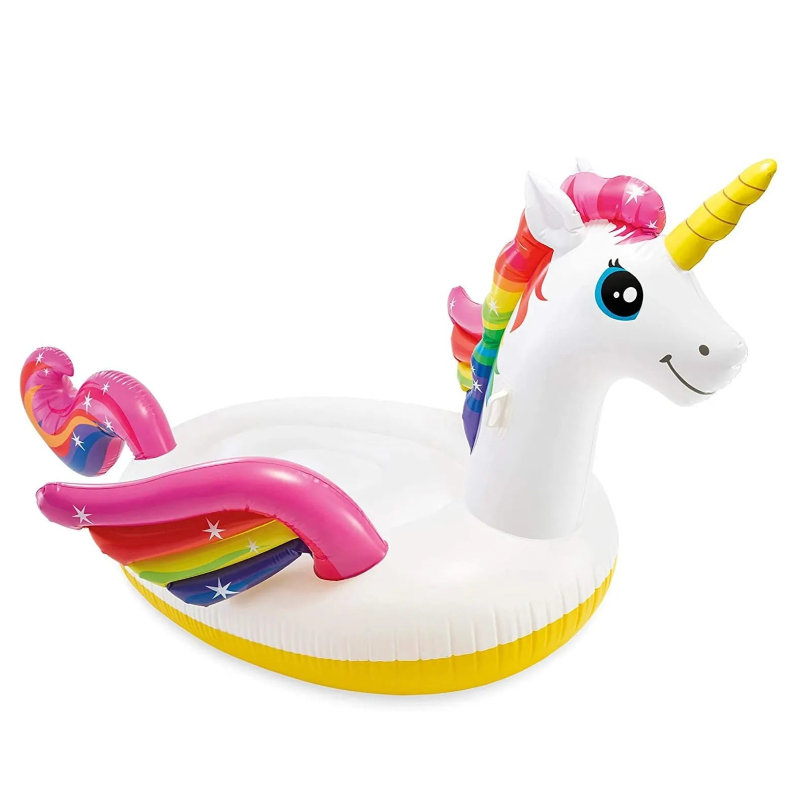 Enjoy the magic of summer and relax on the Intex Inflatable Mega Unicorn Island Float. This giant unicorn float is just what you need to bring fun and whimsy to the swimming pool, lake, or beach. We say "neigh" to other animal-themed pool floats. This inflatable pool ride on blows other floaties out of the water. Sprawl across this giant pool float, because it's got enough room for 1 or 2 lounging adults. If the water greats rough or your friends get jealous, maintain your hold on this large unicorn float by gripping the 2 heavy-duty grab handles. This pool island float is made to last summer after summer with thick, 14-gauge vinyl PVC. This allows your unicorn pool float to stand up to bumps and scuffs with pool walls, cement parking lots, and lakeside rocks and dirt.