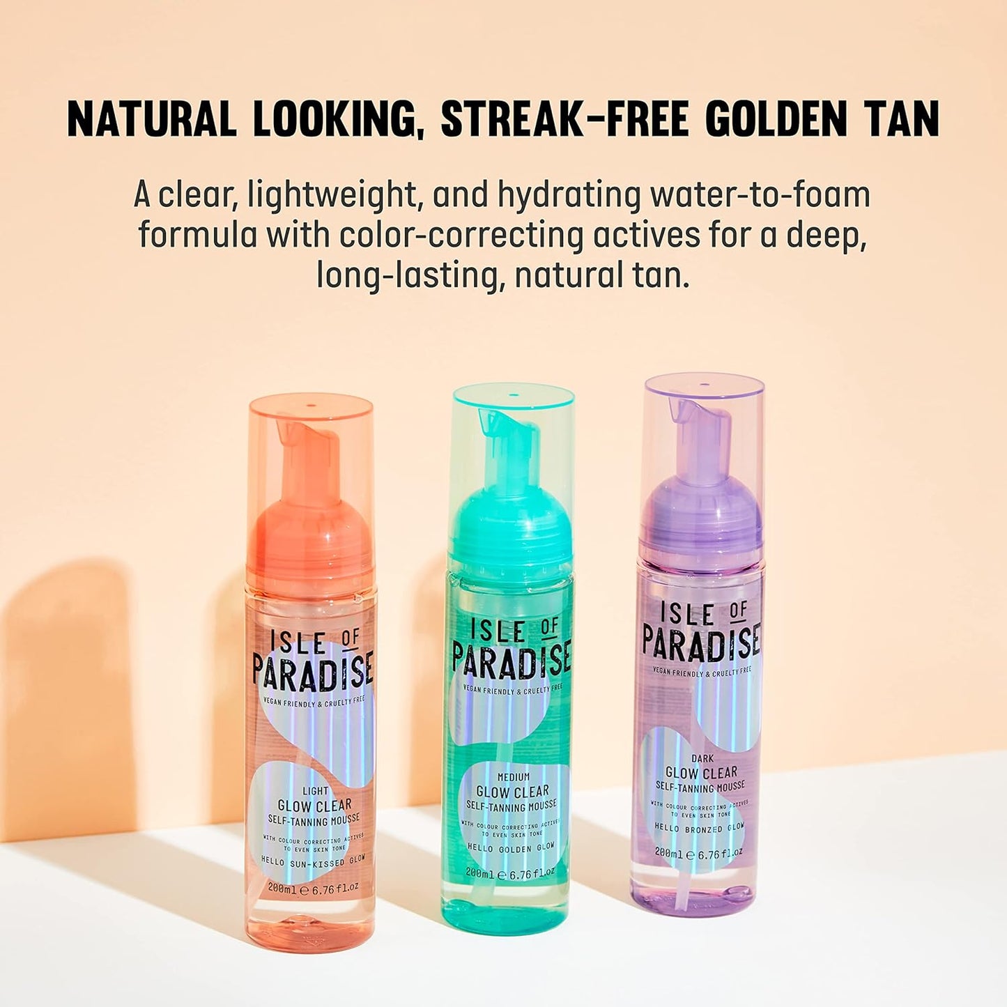 Introducing the Isle of Paradise Medium Glow Clear Mousse, a best-selling formula that encourages a luminous, natural-looking tan. Developing over four to six hours with a deep colour payoff, the mousse delivers up to seven days of wear, its transfer-proof formula resisting staining.
