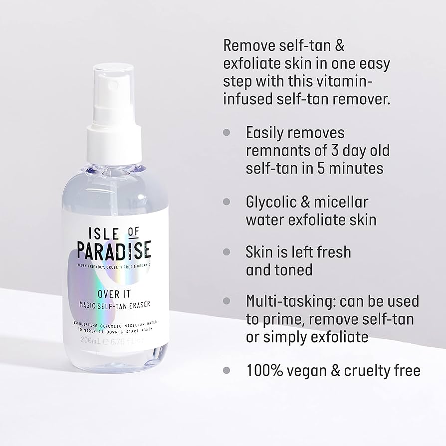 Strip off your tan in one simple step with the Isle of Paradise Over it Magic Self-Tan Eraser; a vitamin-infused tan remover that performs a gentle chemical exfoliation to slough away an old, streak tan so you can start fresh. Formulated with the brand’s signature Oxy-Glow™ complex and a nourishing blend of Avocado, Chia Seed and Coconut oils, the tan-reversing mist utilises a combo of naturally-derived Glycolic and Micellar Water to bring your skin back to its natural tone in a matter of minutes.