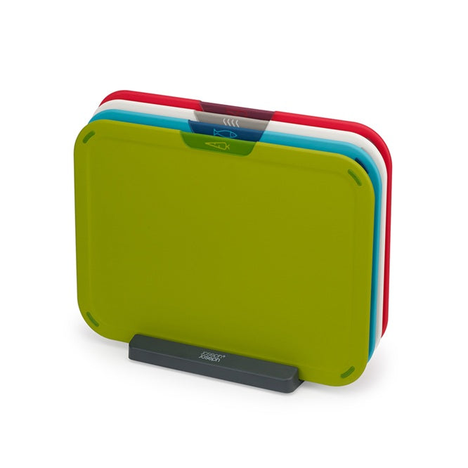 The Joseph Joseph Duo Chopping Boards with Stand promotes both organization and hygiene in your kitchen. The cleverly designed stand neatly stores all four color-coded boards, each clearly marked with a food icon to prevent cross-contamination between different food types. This practical set ensures your chopping boards are always within reach and helps you maintain a clean and efficient cooking space.