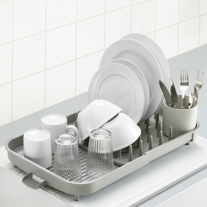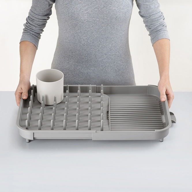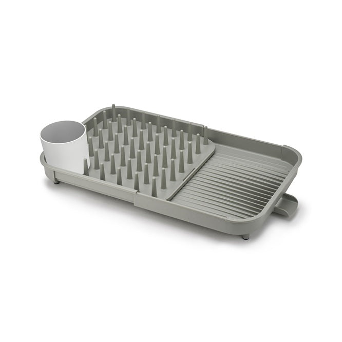 The Joseph Joseph Duo Expandable Dish Rack is a versatile solution for enhancing your dish-drying area. Effortlessly amplify your drying space by extending the rack to nearly double its original size, providing much room for additional dishes. The integrated spout channels away surplus water directly into the sink.