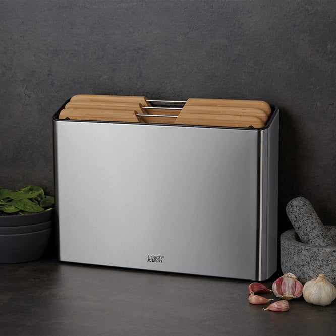 The Joseph Joseph Folio Steel Bamboo Chopping Boards Set offers a practical solution for those who need multiple cutting boards but struggle with storage. This innovative set comprises three durable bamboo chopping boards neatly housed within a sleek stainless steel case, ensuring your kitchen counter remains organized and clutter-free while providing easy access to the right board for every task.